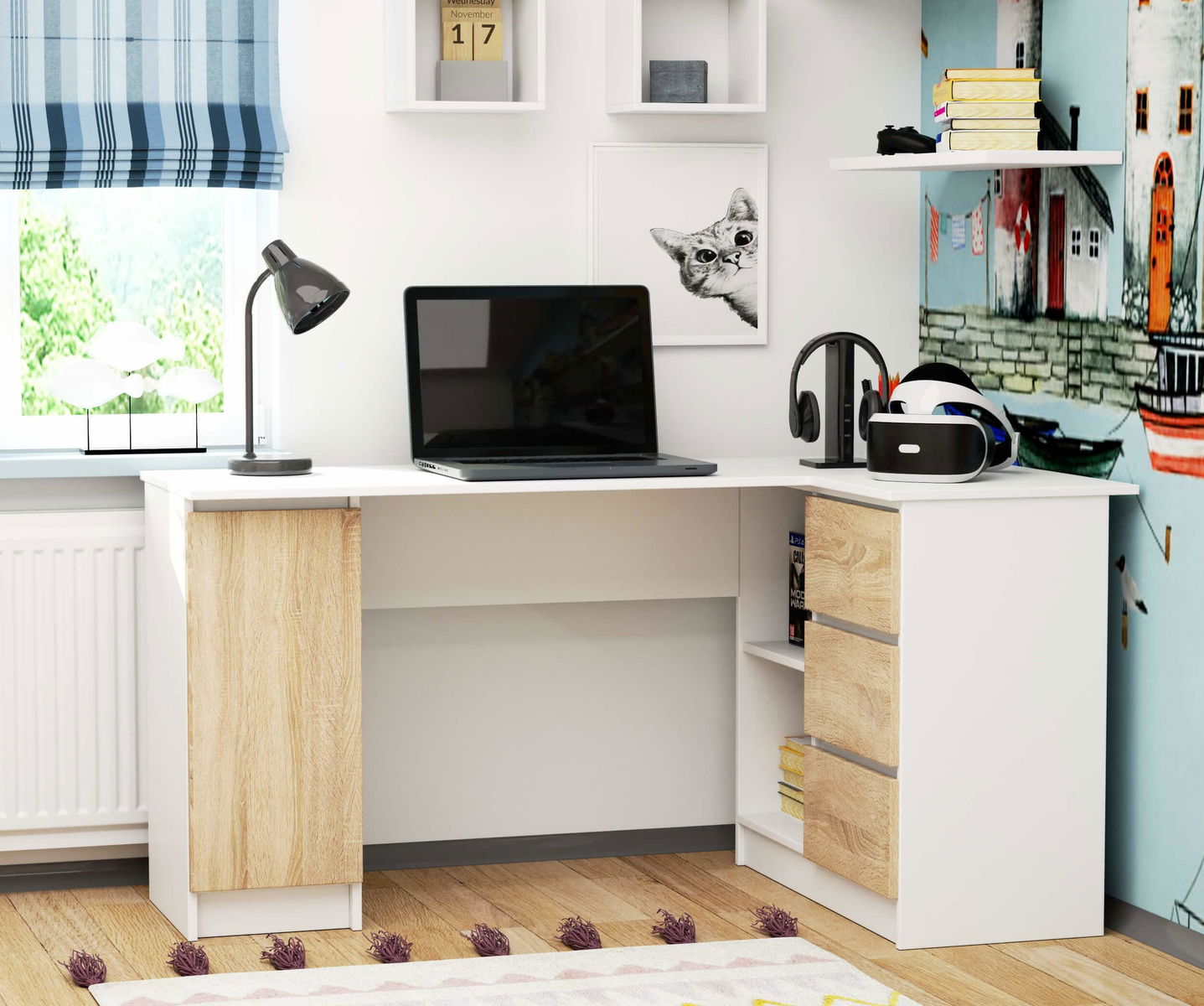 Rohový PC stolek Bevin (bílá + dub sonoma) (P)