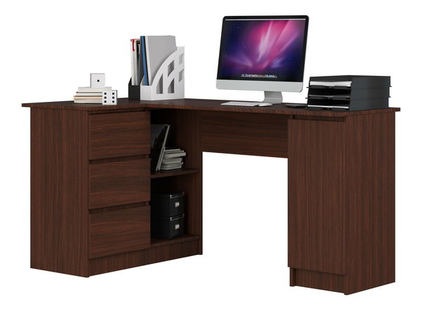 Rohový stůl je zajímavým řešením pro mnoho lidí, kteří si chtějí dokonale uspořádat pracovní či studijní prostor. Materiál, ze kterého je vyroben, je kvalitní laminovaná deska, která je vysoce odolná vůči oděru. Hrany psacího stolu mají zase ABS hranu, takže se lehce nepoškodí. Nábytek má tři zásuvky (pohyblivé díky kovovým válečkovým vodítkům) a police. Můžete v nich uložit kancelářské potřeby, dokumenty, pořadače a dokonce i elektronické zařízení. Díky své jednoduchosti se perfektně hodí do minimalistických a moderních interiérů. Nábytek poskytuje vysoký komfort práce a jistě bude sloužit dlouhá léta. Dostupný ve více barevných provedeních.