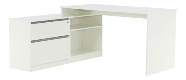 Rohový PC stolek, si najde své místo ve vaší kanceláři nebo ve studentské pokoji. Barevná kombinace bílé s doplňky v barvě beton, bude vhodná do každé místnosti. PC stolek obsahuje velkou pracovní desku, zásuvku, skříňku s vyklápěcími dvířky a úložný prostor, který je rozdělený poličkou.
