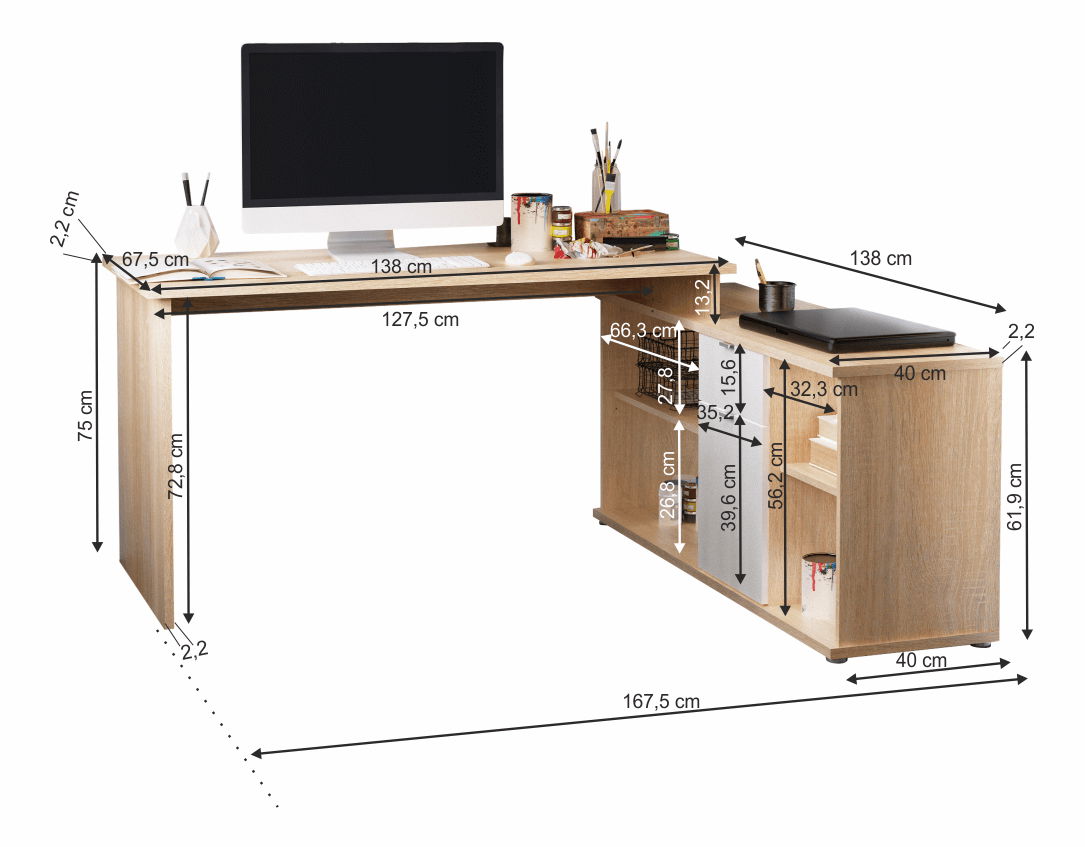 Rohový univerzální PC stolek Dalton vám poskytne množství úložného prostoru. V pravé části PC stolku se nacházejí otevřené poličky a skříňka se zásuvkou uprostřed. Stolek s moderním designem je dodáván v pěkné barevné kombinaci dub sonoma světlý a bílá.