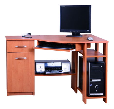 Rohový PC stolek s místem pro PC na straně pravé, výsuvnou deskou na klávesnici umístěnou pod horní deskou a zásuvkou pod kterou jsou dvířka umístěnou na straně levé. Ve středu se nachází jedna polička.