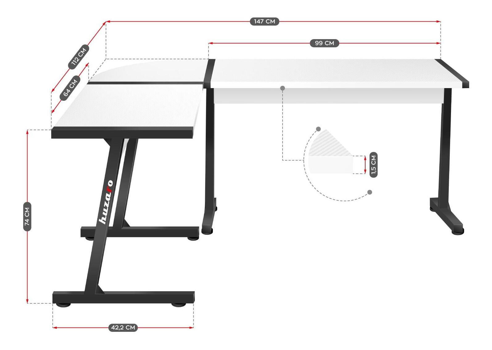 Rozumné využití prostoru je klíčové při zařizování každého interiéru. Nábytek je však málokdy navržen tak, aby využil prostor k maximu. Díky vrchní části ve tvaru L je tento stůl nejen praktický, ale především nastavitelný. V závislosti na vašich preferencích lze psací stůl sestavit dvěma způsoby: se širším nástavcem na levé nebo pravé straně. Celý proces je velmi jednoduchý a uživatelská příručka vás provede bez ohledu na preferovanou stránku. Deska stolu je pokryta speciálním povlakem podobným uhlíku. Jedná se o mimořádně praktické řešení, stolová deska je odolná, odolná vůči poškrábání a nečistotám a zároveň skvěle vypadá. Stolová deska o tloušťce 15 mm, vyrobená z odolné desky, zaručuje stabilitu i při velmi vysokém tlaku.