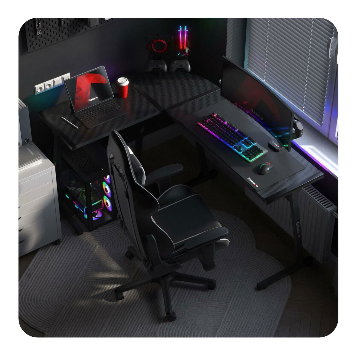 Rozumné využití prostoru je klíčové při zařizování každého interiéru. Nábytek je však málokdy navržen tak, aby využil prostor k maximu. Díky vrchní části ve tvaru L je tento stůl nejen praktický, ale především nastavitelný. V závislosti na vašich preferencích lze psací stůl sestavit dvěma způsoby: se širším nástavcem na levé nebo pravé straně. Celý proces je velmi jednoduchý a uživatelská příručka vás provede bez ohledu na preferovanou stránku. Deska stolu je pokryta speciálním povlakem podobným uhlíku. Jedná se o mimořádně praktické řešení, stolová deska je odolná, odolná vůči poškrábání a nečistotám a zároveň skvěle vypadá. Stolová deska o tloušťce 15 mm, vyrobená z odolné desky, zaručuje stabilitu i při velmi vysokém tlaku. Díky 4 hudebním režimům bude osvětlení stolu měnit barvy a pulsovat v rytmu vašich oblíbených skladeb. Vše, co potřebujete, je telefon s připojením Bluetooth pro pohodlné ovládání LED diod pomocí speciální aplikace. Ovládejte osvětlení z pohodlí vaší pohovky. Díky bezdrátovému dálkovému ovladači s dosahem až 8 metrů můžete měnit osvětlení pracovního stolu odkudkoli v místnosti. Intuitivní ovladač zaručuje snadné ovládání. Osvětlení můžete změnit také pomocí vyhrazené aplikace ve vašem chytrém telefonu.
