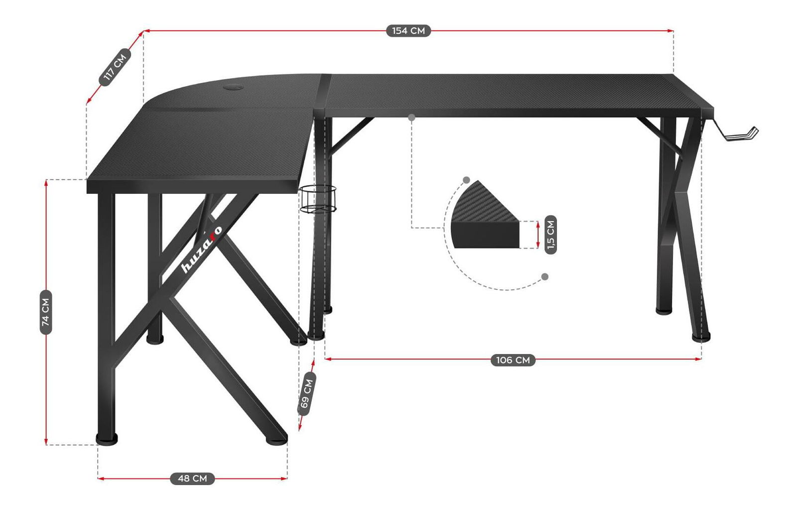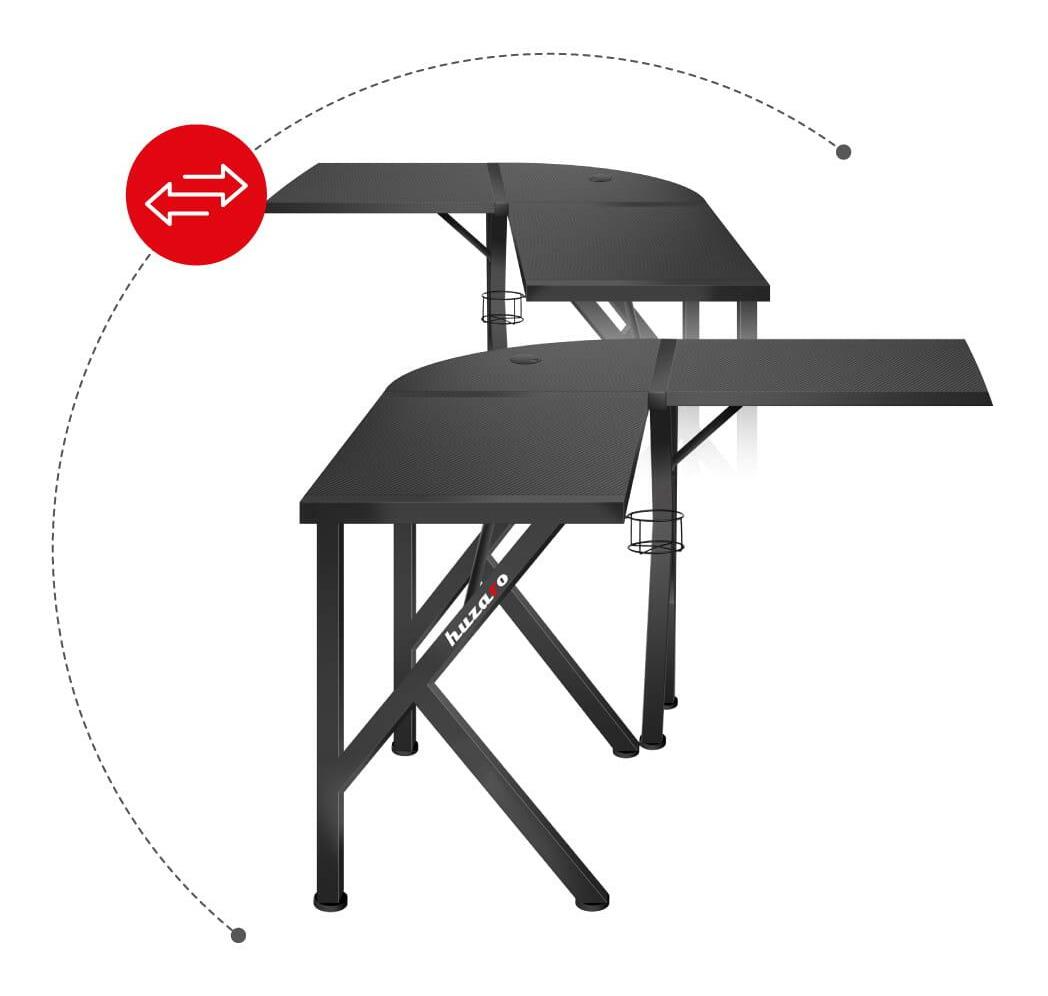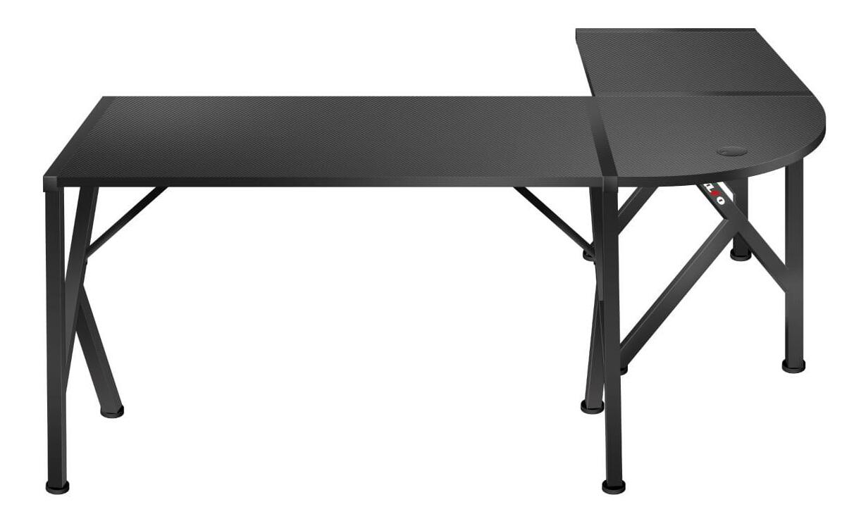 Díky speciálnímu svršku ve tvaru L je stůl nejen praktický, ale především nastavitelný. Nábytek byl pečlivě promyšlen, aby se přizpůsobil vašemu interiéru. V závislosti na vašich preferencích lze psací stůl sestavit dvěma způsoby: se širším nástavcem na levé nebo pravé straně. Celý proces je velmi jednoduchý a návod k použití vás provede. Ne náhodou má pracovní deska charakteristický tvar „L“. Promyšlený design zvyšuje množství prostoru, kterého můžeme využít při práci nebo studiu. Díky tomu je vše vždy po ruce. Deska stolu je pokryta speciálním povlakem podobným uhlíku. Jedná se o mimořádně praktické řešení, stolová deska je odolná, odolná vůči poškrábání a nečistotám a zároveň skvěle vypadá. Stolová deska o tloušťce 15 mm, vyrobená z odolné desky, zaručuje stabilitu i při velmi vysokém tlaku. Stůl má centrálně umístěný kabelový vstup, díky kterému si pohodlně a efektivně uspořádáte všechna připojení vašeho zařízení. Pohodlný, praktický držák na sluchátka. Když sluchátka nepoužíváte, visí bezpečně, aniž by zabírala místo na vašem stole. Speciální, pohodlný držák na nápoje. Snadno a bezpečně do ní uložíte plechovky, láhve a sklenice. Držák sklenice snižuje riziko náhodného zaplavení cenného vybavení.