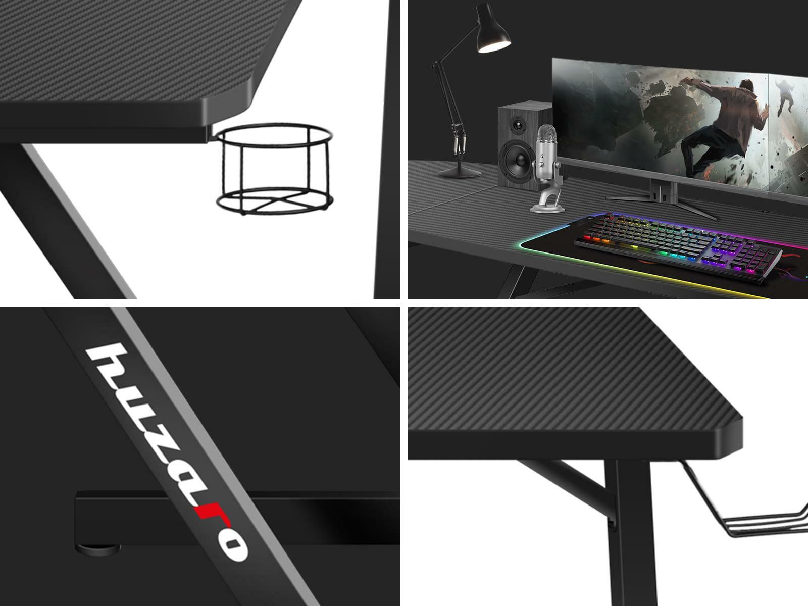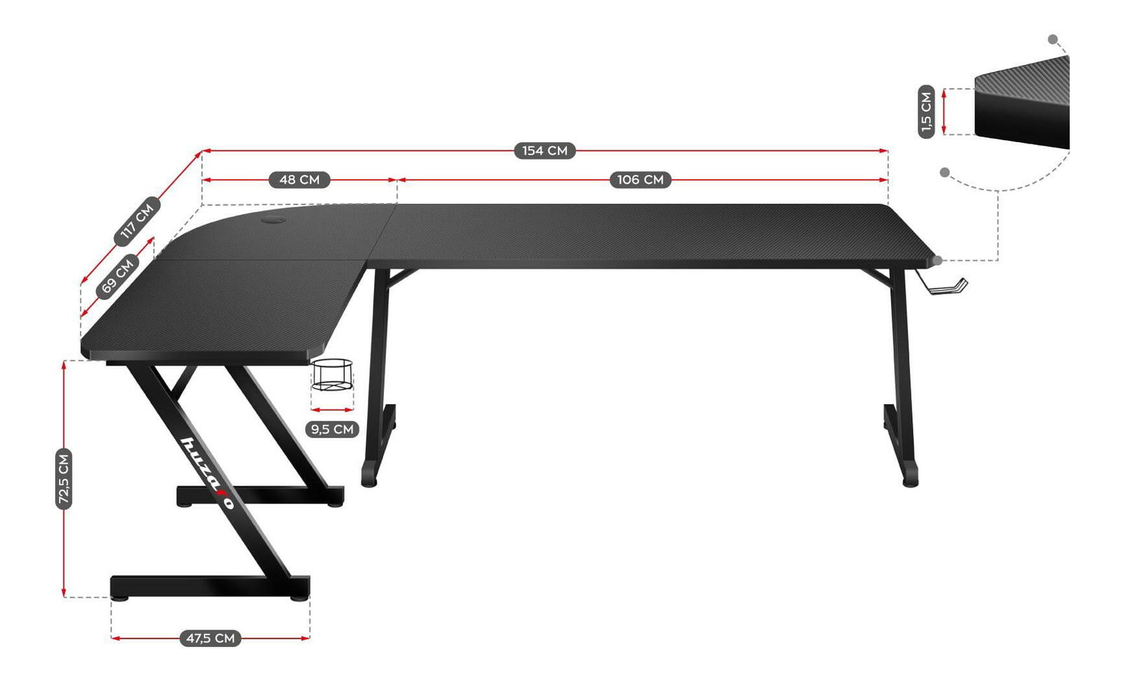 Díky speciálnímu svršku ve tvaru L je stůl nejen praktický, ale především nastavitelný. Nábytek byl pečlivě promyšlen, aby se přizpůsobil vašemu interiéru. V závislosti na vašich preferencích lze psací stůl sestavit dvěma způsoby: se širším nástavcem na levé nebo pravé straně. Celý proces je velmi jednoduchý a návod k použití vás provede. Ne náhodou má pracovní deska charakteristický tvar „L“. Promyšlený design zvyšuje množství prostoru, kterého můžeme využít při práci nebo studiu. Díky tomu je vše vždy po ruce. Deska stolu je pokryta speciálním povlakem podobným uhlíku. Jedná se o mimořádně praktické řešení, stolová deska je odolná, odolná vůči poškrábání a nečistotám a zároveň skvěle vypadá. Stolová deska o tloušťce 15 mm vyrobená z odolné desky zajišťuje odolnost a stabilitu i při velmi vysokém tlaku. Stůl má strategicky umístěný vstup pro uspořádání kabelů. Namontováním v samém středu nábytku můžete stanici nastavit na obě strany tím nejpohodlnějším způsobem. Pohodlný, praktický držák na sluchátka. Když sluchátka nepoužíváte, visí bezpečně, aniž by zabírala místo na pracovní desce. Držák lze rychle a pohodlně skrýt pod pracovní stůl. Speciální, pohodlný držák na nápoje. Snadno a bezpečně do ní uložíte plechovky, láhve a sklenice. Držák lze snadno a rychle složit a schovat pod psací stůl.
