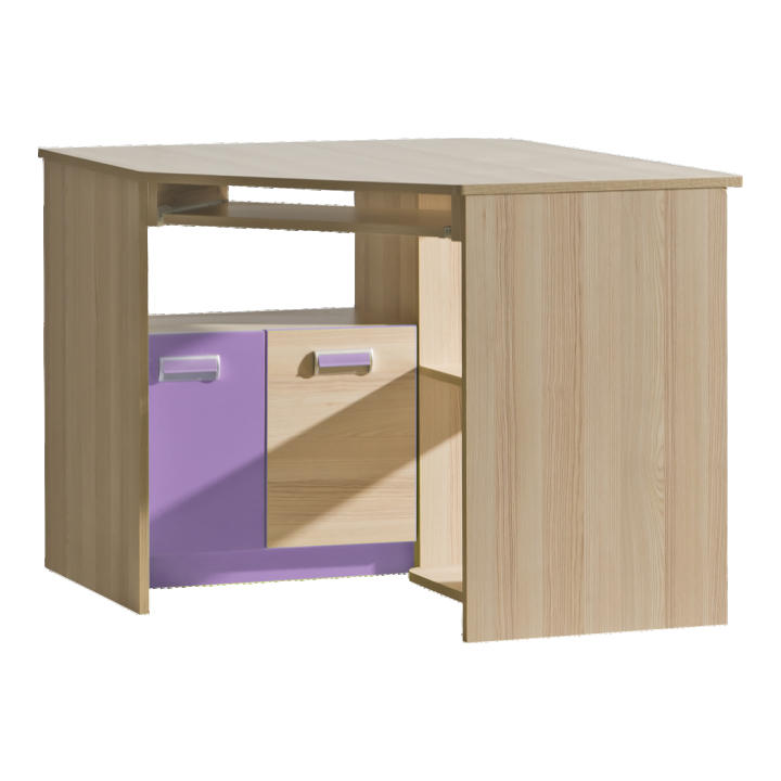 Praktický rohový PC stolek se dvěma skříňkami v levé části a poličkami v pravé části. V pravé části se nachází prostor pro počítač. Stolek má také výsuvnou desku pod klávesnici. Veselý design stolku je vhodný zejména do studentských a dětských pokojů.