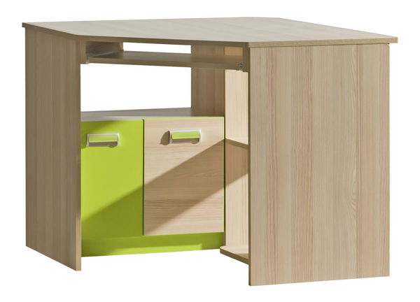 Praktický rohový PC stolek se dvěma skříňkami v levé části a poličkami v pravé části. V pravé části se nachází prostor pro počítač. Stolek má také výsuvnou desku pod klávesnici. Veselý design stolku je vhodný zejména do studentských a dětských pokojů.