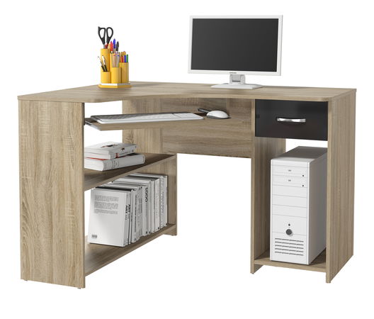 Rohový PC stolek v barevném provedení dub Sonoma má množství otevřeného úložného prostoru a jednu zásuvku v pravé horní části s lesklým černým provedením a kovovým úchytem. Ve střední části obsahuje výsuvnou plochu pro umístění klávesnice a myši.