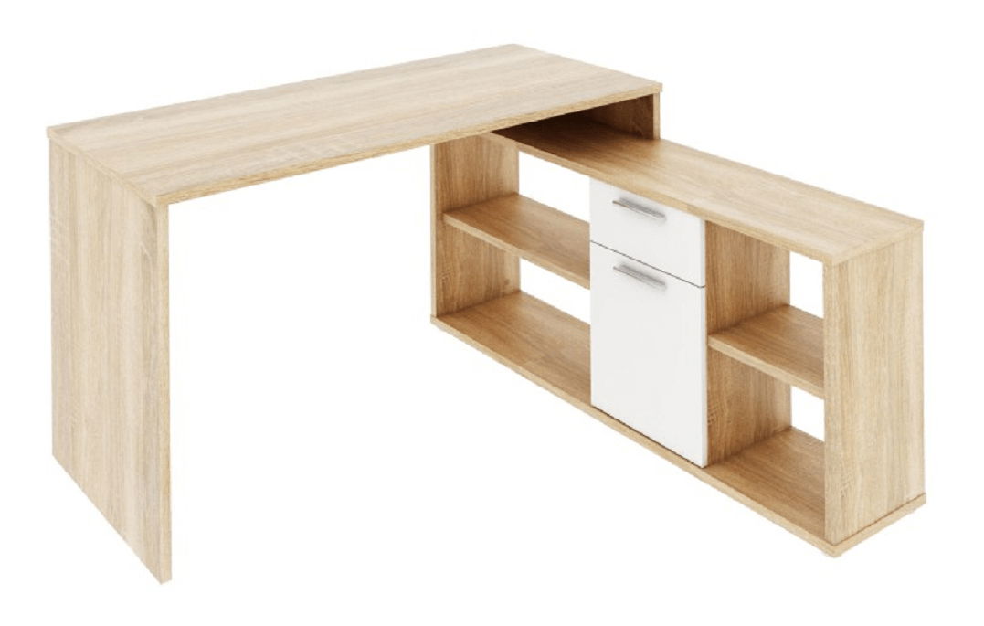 ZobrazitElegantní rohový PC stolek z materiálu DTD fóliované. Skládá se ze 2 částí: levá část je vybavena jednou poličkou po stranách a uprostřed je mezi nimi zásuvka se skříňkou. Pravá část je jednoduchý PC stolek na 2 nohách. Provedení dub sonoma a bílá barva.