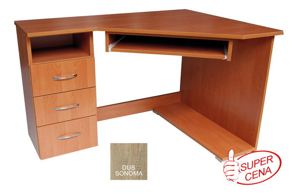 Rohový jednobarevný PC stolek s menšími rozměry ideální do menších pracoven vyhotoven v levém provedení. Na pravé straně je na spodku umístěna polička, která je primárně určena na klasickou skříň počítače. Tato polička je umístěna jen pár centimetrů od země. Na straně levé se nad sebou nacházejí 3 zásuvky a nad nimi je umístěna otevřená polička. Pod horní deskou se nachází výsuvná polička pro klávesnici. Kvalitu zpracování potvrzuje použití odolných ABS hran na všech místech řezu desky a vybavení stolku odolnými kovovými úchyty. Barevné provedení na výběr: olše, ořech, buk, dub sonoma. Pravé provedení.