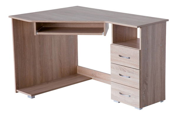 Rohový jednobarevný PC stolek s menšími rozměry ideální do menších pracoven vyhotoven v pravém provedení. Na levé straně je na spodku umístěna polička, která je primárně určena na klasickou skříň počítače. Tato polička je umístěna jen pár centimetrů od země. Na straně pravé se nad sebou nacházejí 3 zásuvky a nad nimi je umístěna otevřená polička. Pod horní deskou se nachází výsuvná polička pro klávesnici. Kvalitu zpracování potvrzuje použití odolných ABS hran na všech místech řezu desky a vybavení stolku odolnými kovovými úchyty.