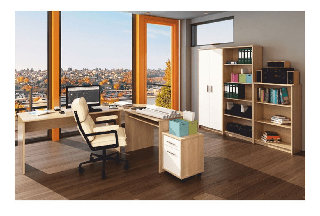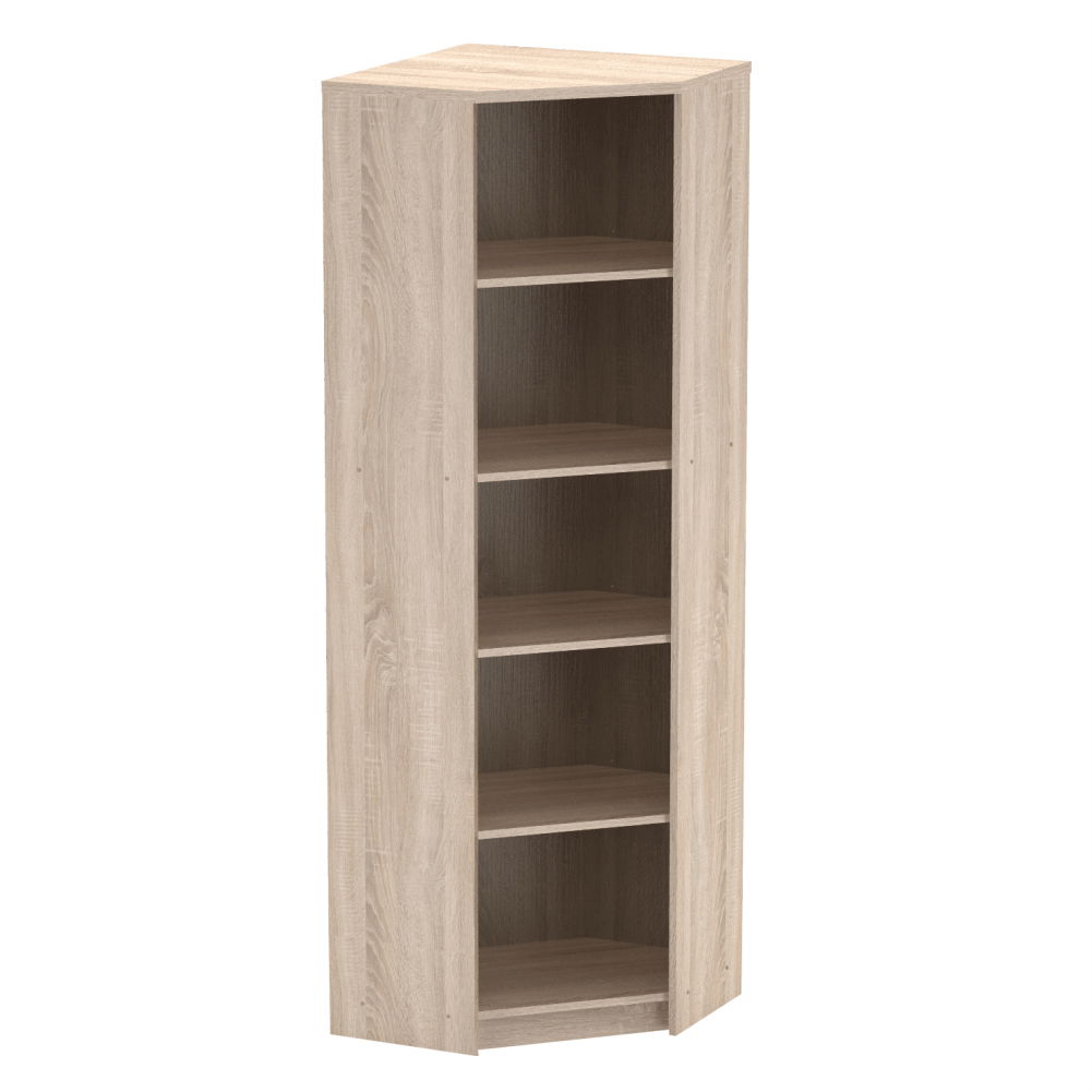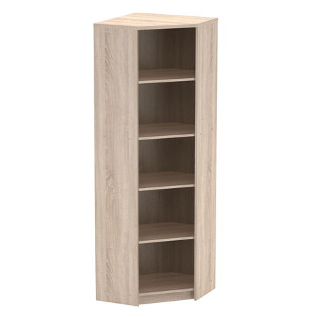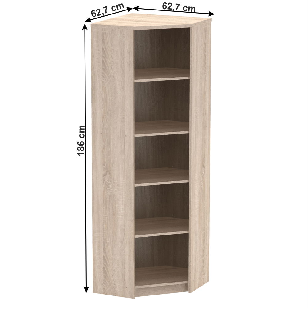 Tento minimalistický vysoký rohový regál se hodí do moderní kanceláře, či pracovny. Umístit jej můžete i do dětského pokoje, jednoduše tam, kde potřebujete otevřený úložný prostor na šanony, knihy nebo krabice. Úložný prostor tvoří čtyři police, čímž vznikne až pět odkládacích ploch. Regál je dodán se spodním soklem.