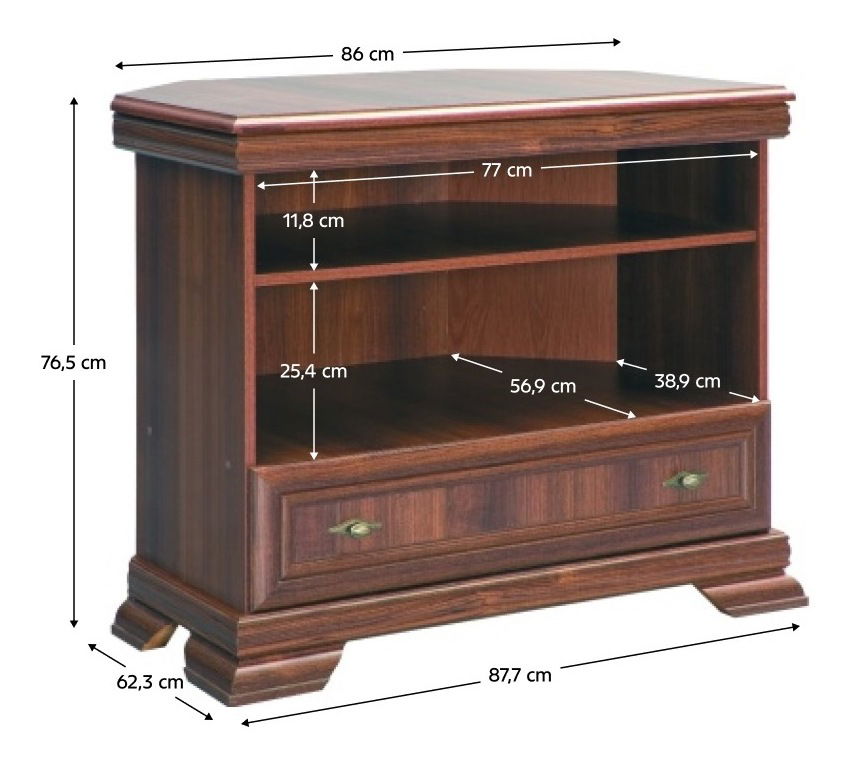 Praktický rohový TV stolek Kraz unikátního rustikálního vzhledu využijete v obývacích pokojích, ložnicích nebo pracovnách. V dolní části se nachází zásuvka. V horní části jsou poličky pro vaše AV zařízení. Má elegantní vyřezávané nohy a lišty. Zásuvka má kovové úchyty. Barevné provedení stolku je Samoa king.