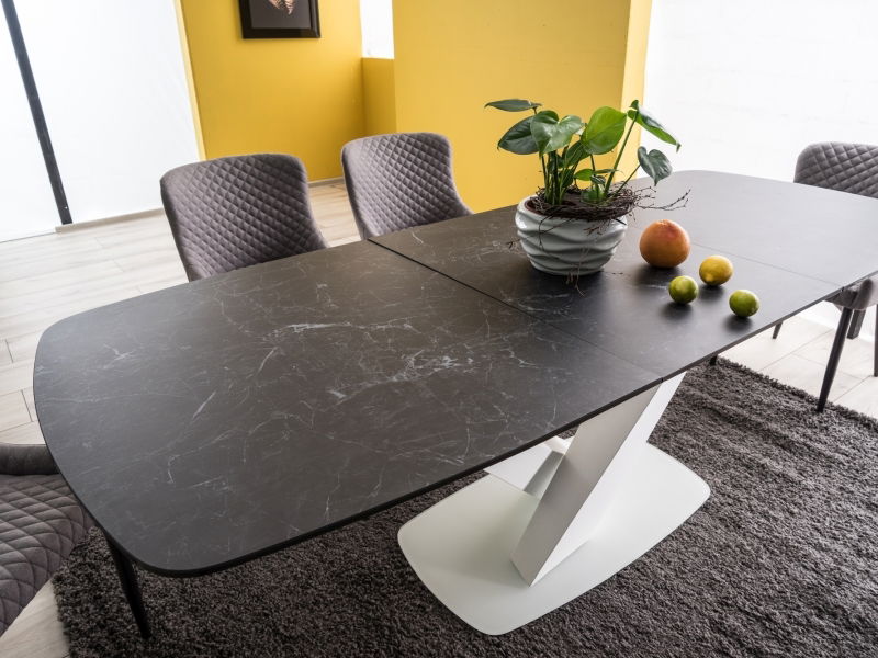 Rozkládací jídelní stůl Carmen v černo-bílém provedení o rozměrech 160-220 cm je ideální volbou pro větší rodiny nebo přátelská setkání. Stůl dokáže pohodlně ubytovat 8 a více osob a jeho výška 76 cm a hloubka 90 cm zajišťuje dostatek místa pro pohodlné sezení is talíři a skleničkami. Díky možnosti rozložení si můžete stůl přizpůsobit počtu hostů a ušetřit tak místo v místnosti. Jídelní stůl Carmen v černo-bílém provedení skvěle zapadne do moderní domácnosti a svým praktickým využitím vám usnadní organizaci společenských událostí.