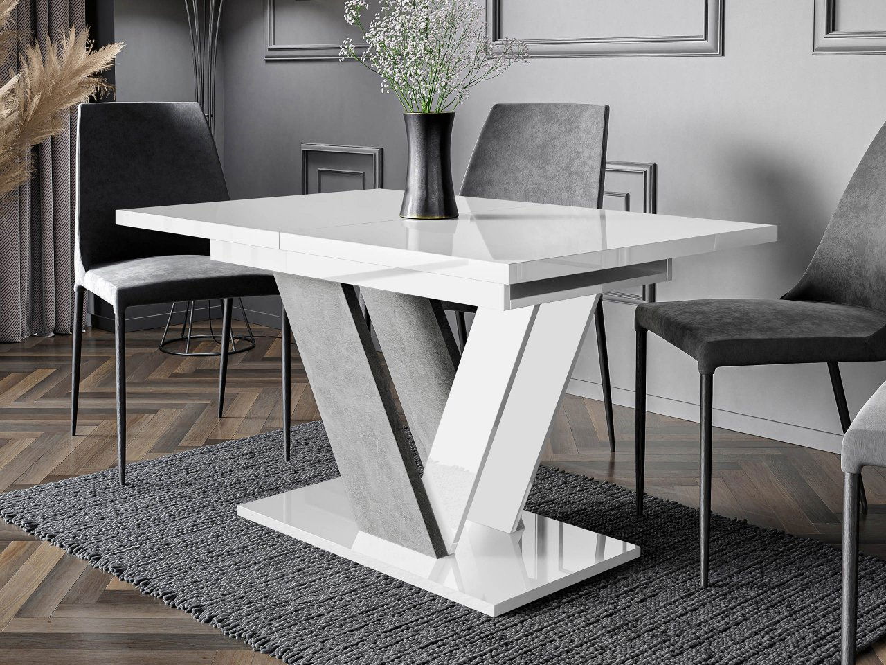 Rozkládací jídelní stůl Granger (lesk bílý + beton) (pro 2-6 osob)