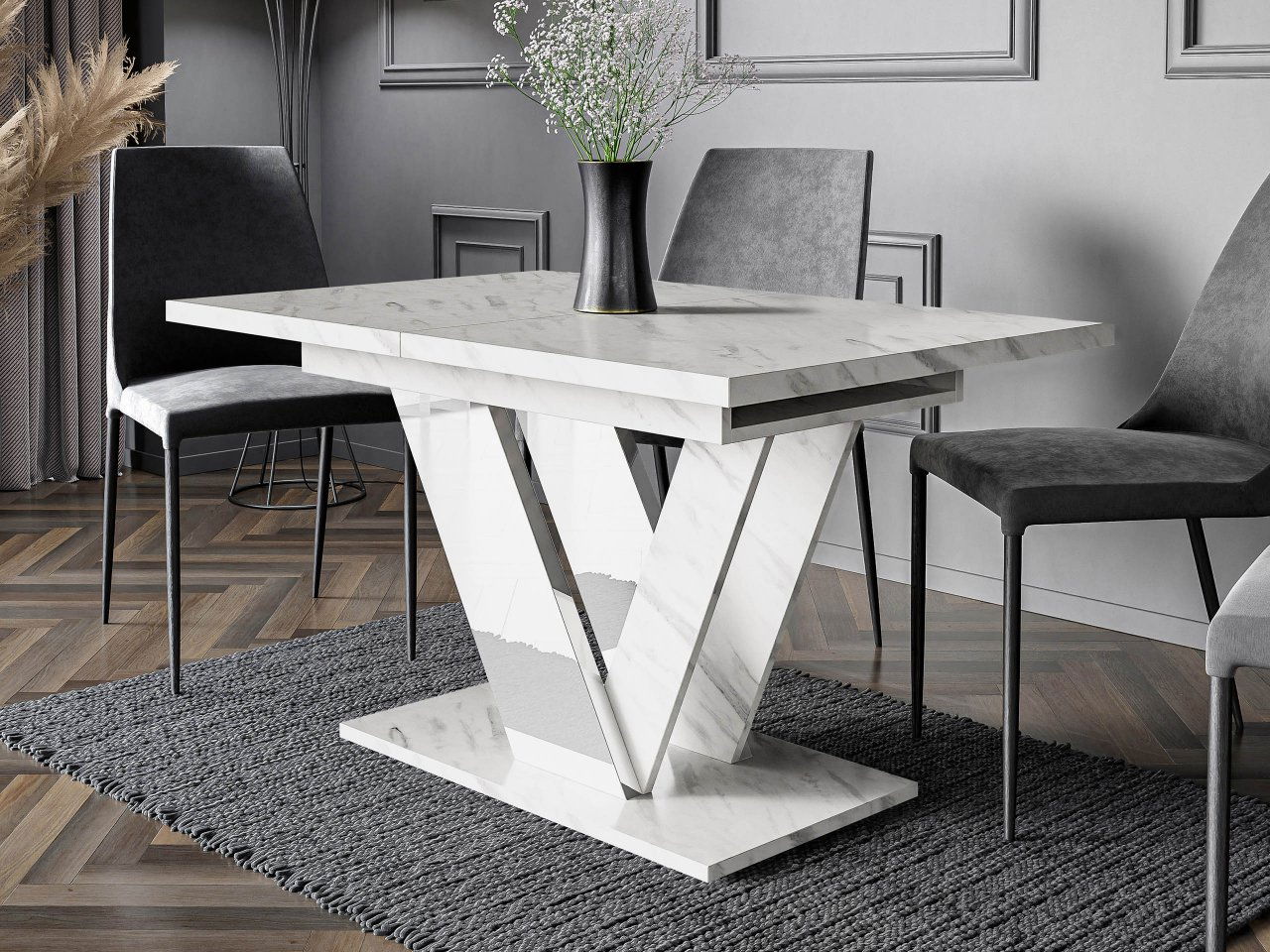 Rozkládací jídelní stůl Granger (mramor bílý + lesk bílý) (pro 2-6 osob)