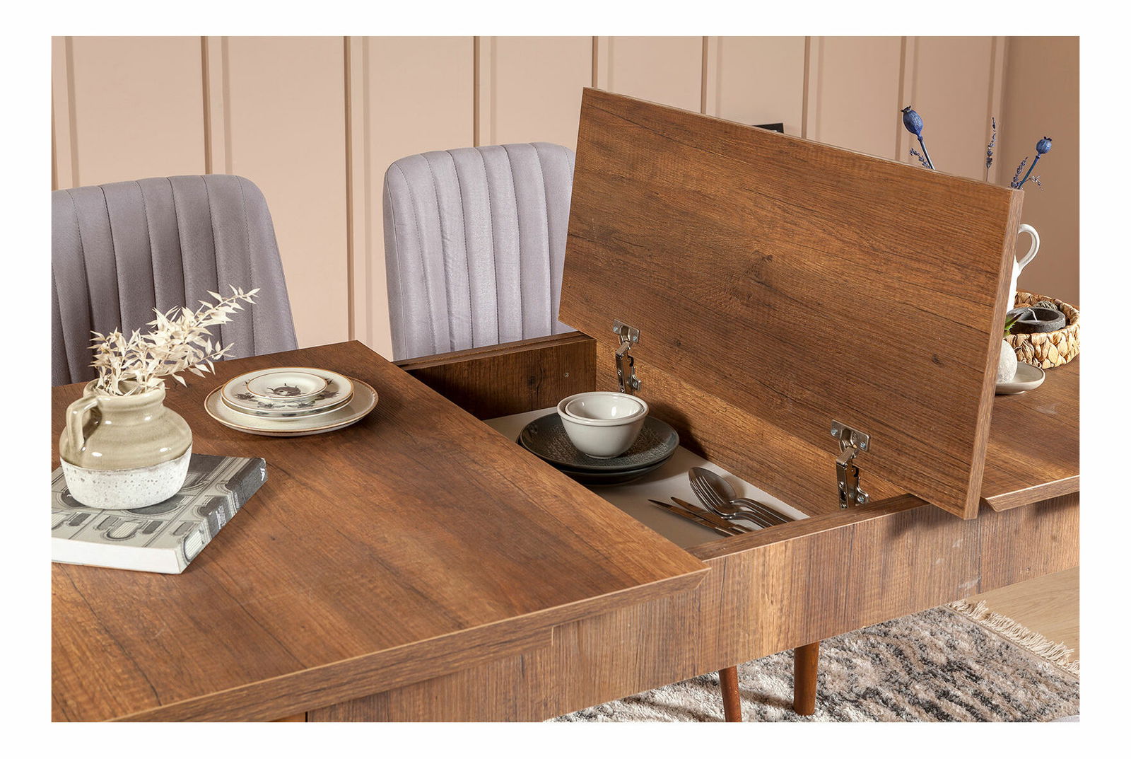 Rozkládací jídelní stůl se 2 židlemi a 2 lavicemi Vlasta (ořech + šedá)