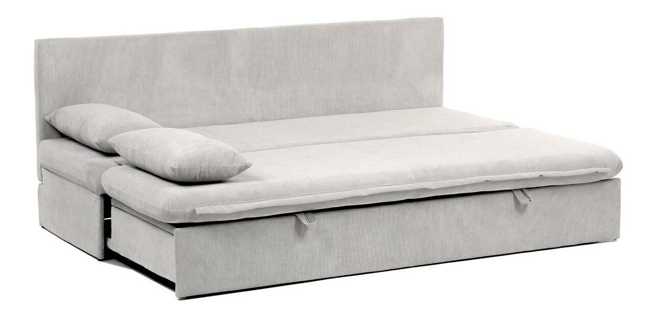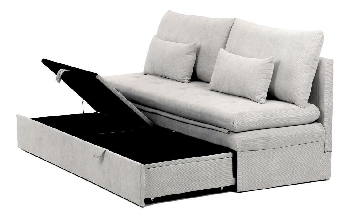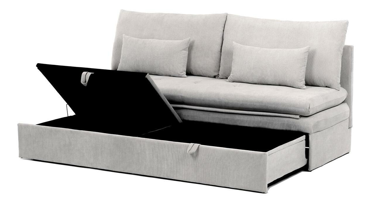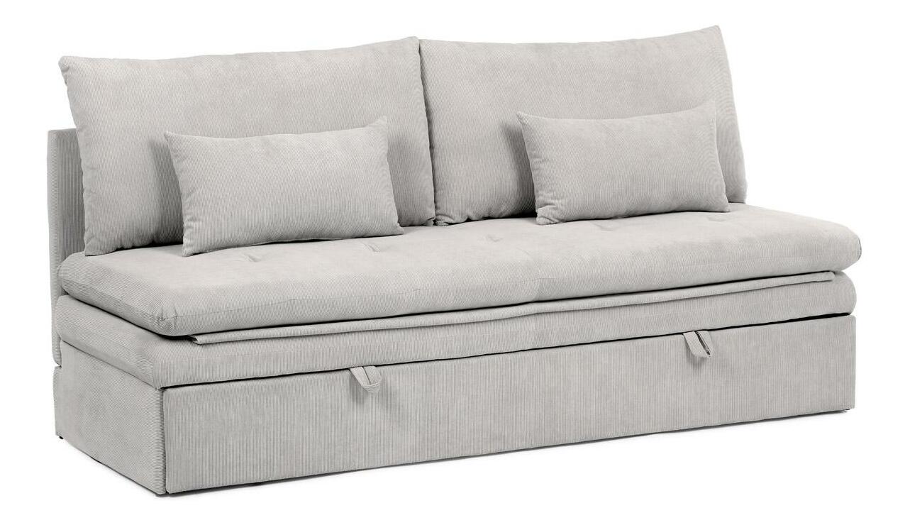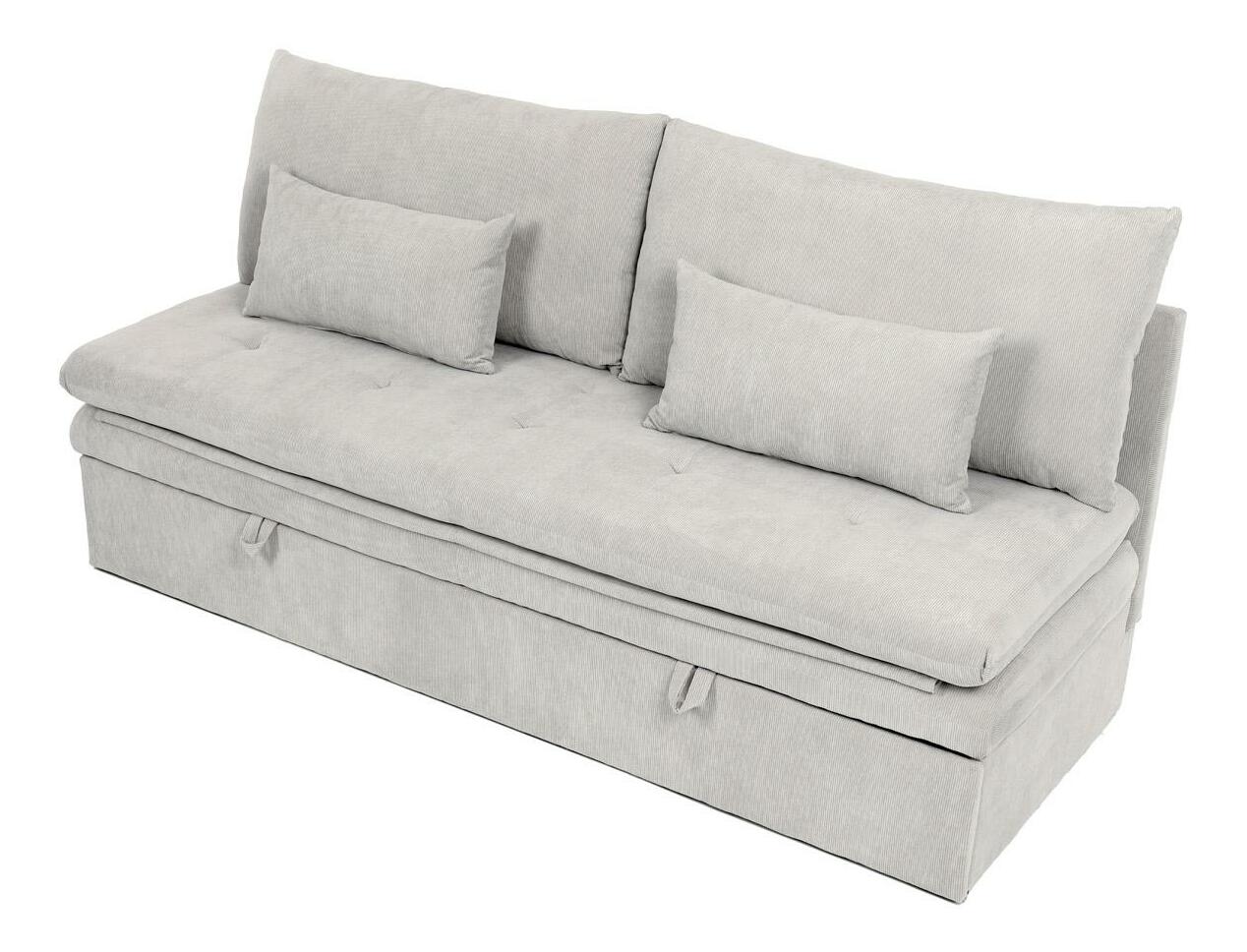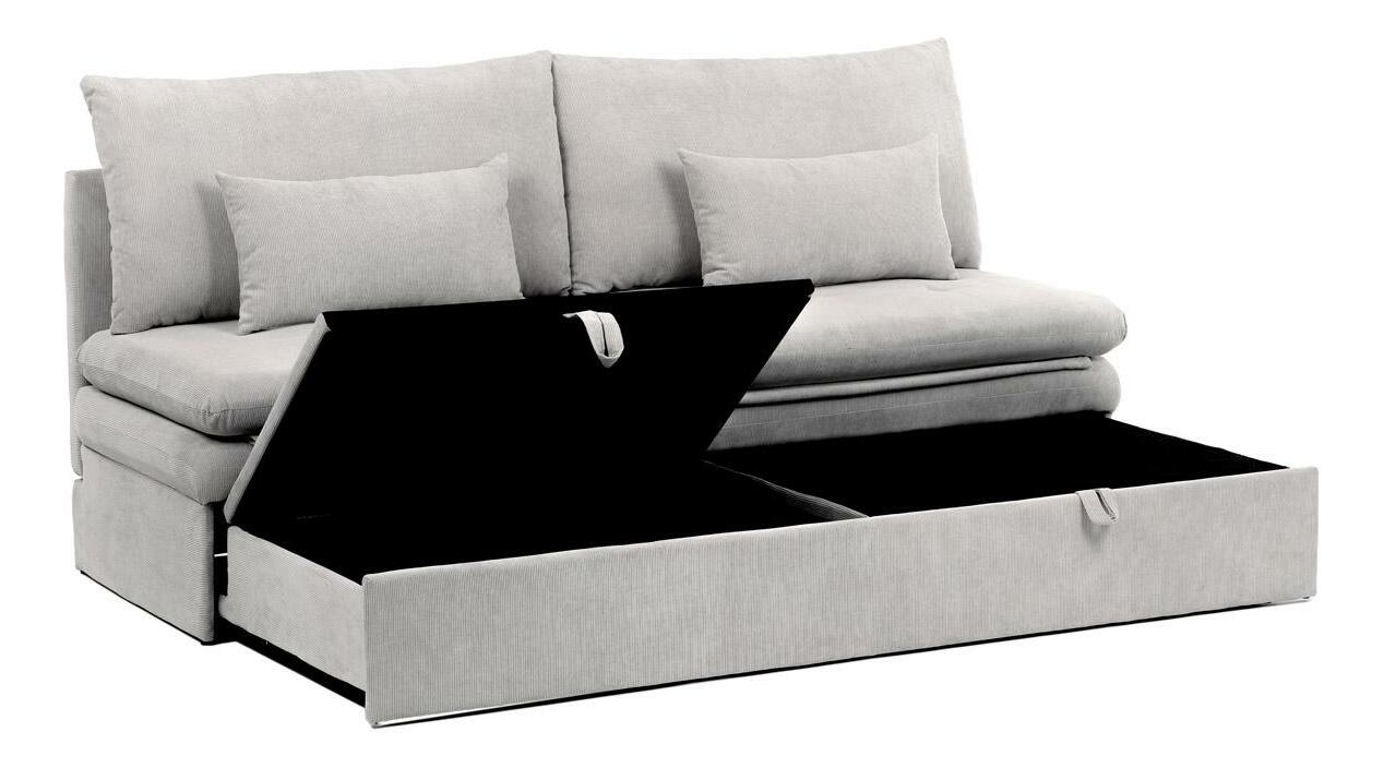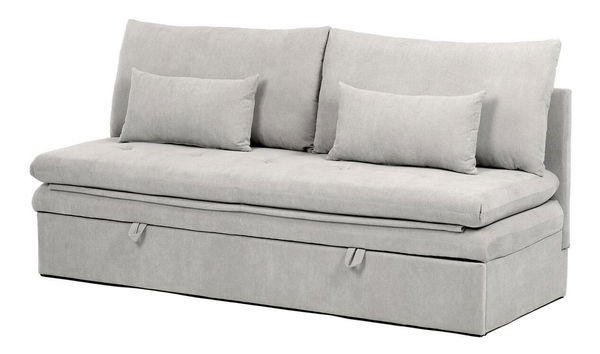 ZobrazitRozkládací pohovka s úložným prostorem, béžové barvy. Pohovka je vybavena třemi velkými opěrnými polštáři a dvěma menšími dekorativními polštáři. hosty. Kombinuje moderní design s funkčností a komfortem.
