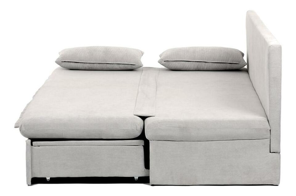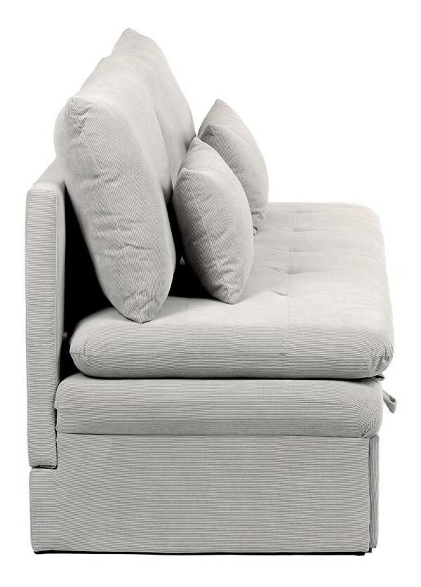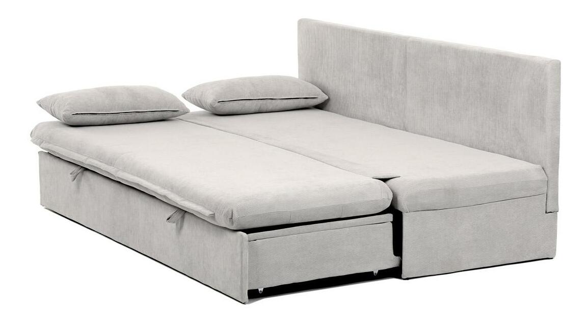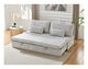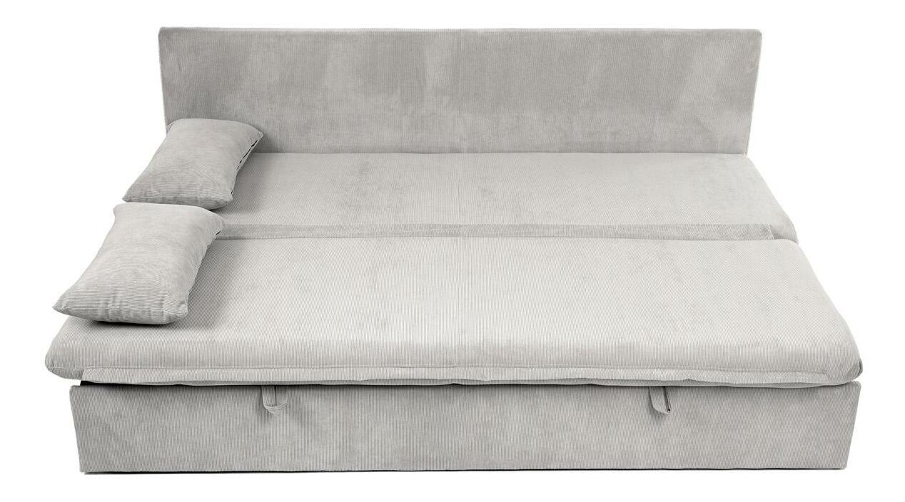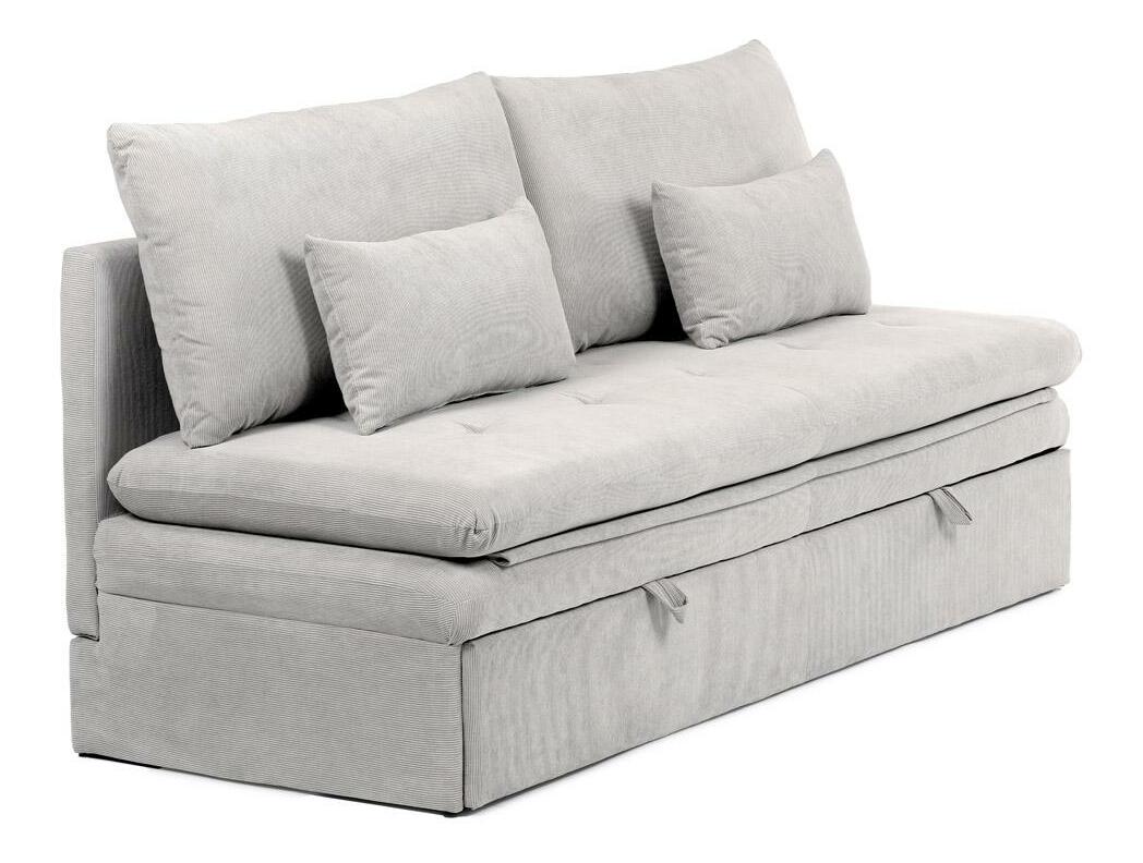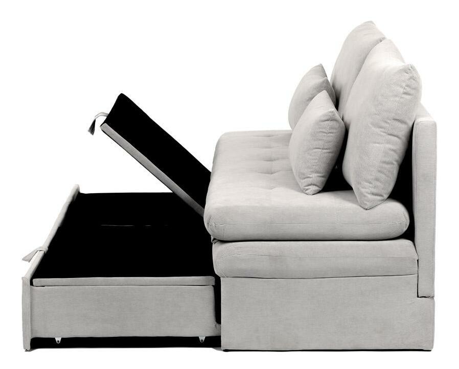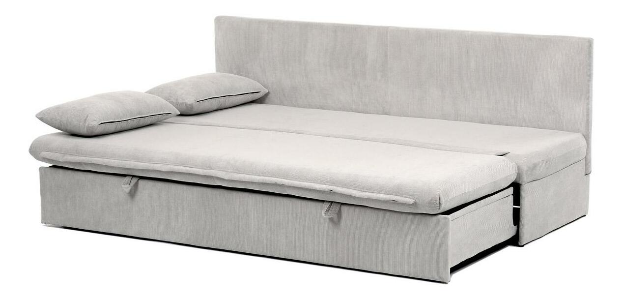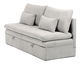 ZobrazitRozkládací pohovka s úložným prostorem, béžové barvy. Pohovka je vybavena třemi velkými opěrnými polštáři a dvěma menšími dekorativními polštáři. hosty. Kombinuje moderní design s funkčností a komfortem.