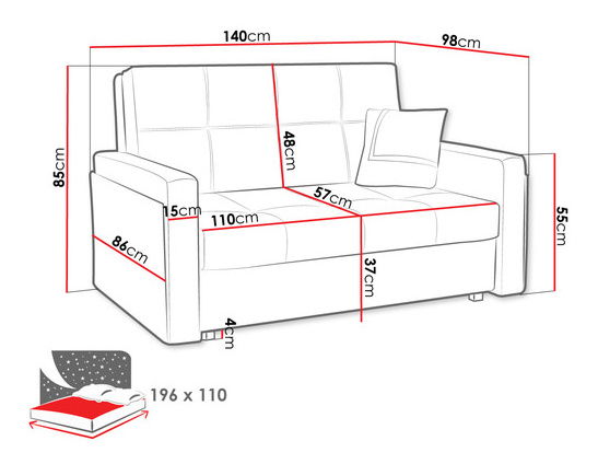 ZobrazitRozkládací křeslo je ideální volbou pro ty, kteří hledají pohodlí a styl. Dvoumístná pohovka Clivia Mel II je kompaktní kus nábytku pro denní i noční relaxaci. Nabízí pohodlnou spací plochu o rozměrech 196 x 110 cm. Výborně se hodí do pokoje pro hosty, kde můžete pohodlně přenocovat s přáteli nebo rodinou zdaleka. Pohovka se stane zajímavým prvkem vašeho interiéru díky svému neobvyklému designu a zajímavé barevné kombinaci látek, kterými je čalouněná. Vyberte si z několika módních odstínů a vytvořte si doma jedinečnou atmosféru. Rozměry: délka: 140 cm, šířka: 98 cm, výška: 86 cm, prostor na spaní: 196 x 110 cm, rozměry úložného prostoru: délka: 109 cm, šířka: 66 cm, výška: 19 cm Provedení: rám: borovicové dřevo + dřevotříska, sedátko: pěna T25/42, rozkládací pohovka, má funkci spánku, úložný prostor, automatický mechanismus usnadňující rozkládání, kovové nohy, čalouněné opěradlo napevno, polštář bez zipu v ceně, volně stojící pohovka (zadní část čalouněná látkou) Záruka: 24 měsíců