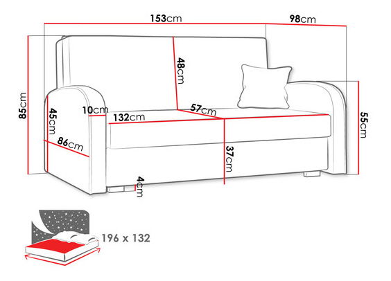 ZobrazitRozkládací pohovka je ideální volbou pro ty, kteří hledají pohodlí a styl. Rozměry: délka: 153 cm, šířka: 98 cm, výška: 85 cm, pocha na spaní: 196 x 132 cm, Rozměry kontejneru: délka: 129 cm, šířka: 66 cm, výška: 19 cm Provedení: rám: borovicové dřevo + dřevotříska 4 taštičky: T25/42 pěna, otevřená pohovka, má funkci spánku, nádoba na podestýlku, automatický stroj pro snadné rozkládání, dřevěné nohy, čalouněné opěradlo pevně fixované, polštář bez zipu v ceně, pohovka je volně stojící (záda potažená látkou) Záruka: