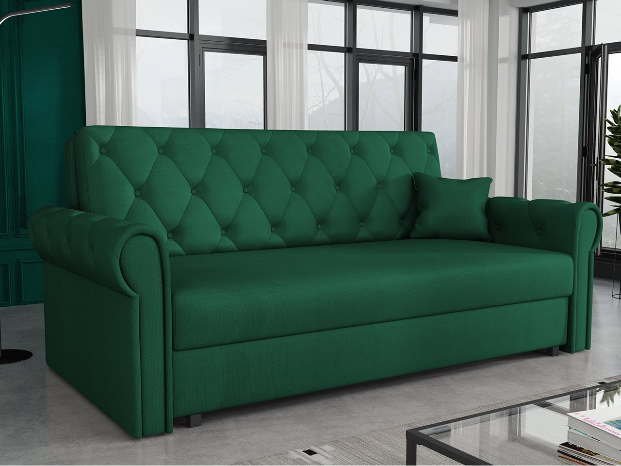 ZobrazitElegantní design rozkládací pohovky Clovea Roma III zkrášlí interiér obývacího pokoje. Eleganci zde způsobuje působivě prošívané opěradlo i jím zdobené boky. Stylový kosočtvercový vzor zakončený hluboce vsazenými knoflíčky je detail, který dokonale ozdobí interiér klasického nebo loftového obývacího pokoje. K přednostem pohovky patří také úložný prostor. Prostorný úložný prostor se nachází pod sedadlem, kde můžete snadno uložit polštáře a náhradní přikrývku. Speciální automat vám usnadní přípravu pohodlného místa na spaní. S jeho pomocí můžete pohovku rozložit jen několika pohyby a zařídit si místo pro celonoční odpočinek.
