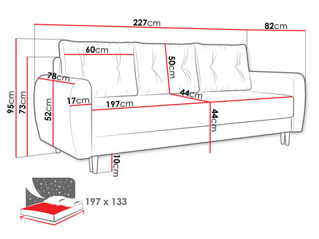ZobrazitPociťte pohodlí, které nabízí rozkládací pohovka Keklat! Je potažena plyšem, měkkým na dotek, který zvyšuje komfort používání a dodává nábytku elegantní vzhled. Vysoké dřevěné nohy v kombinaci s prošívanými polštáři úspěšně zapadnou jak do rustikálního stylu interiéru, tak do toho zařízeného ve skandinávském nebo provensálském stylu. Největší výhodou pohovky je ovšem její funkce na spaní. V okamžiku ji můžete přeměnit na pohodlnou postel. Pohovka na spaní je ideálním řešením pro hosty nebo v situacích, kdy potřebujete další místo k odpočinku. Zajistěte si každodenní komfort a pohodlí, vyberte si pohovku Keklat!