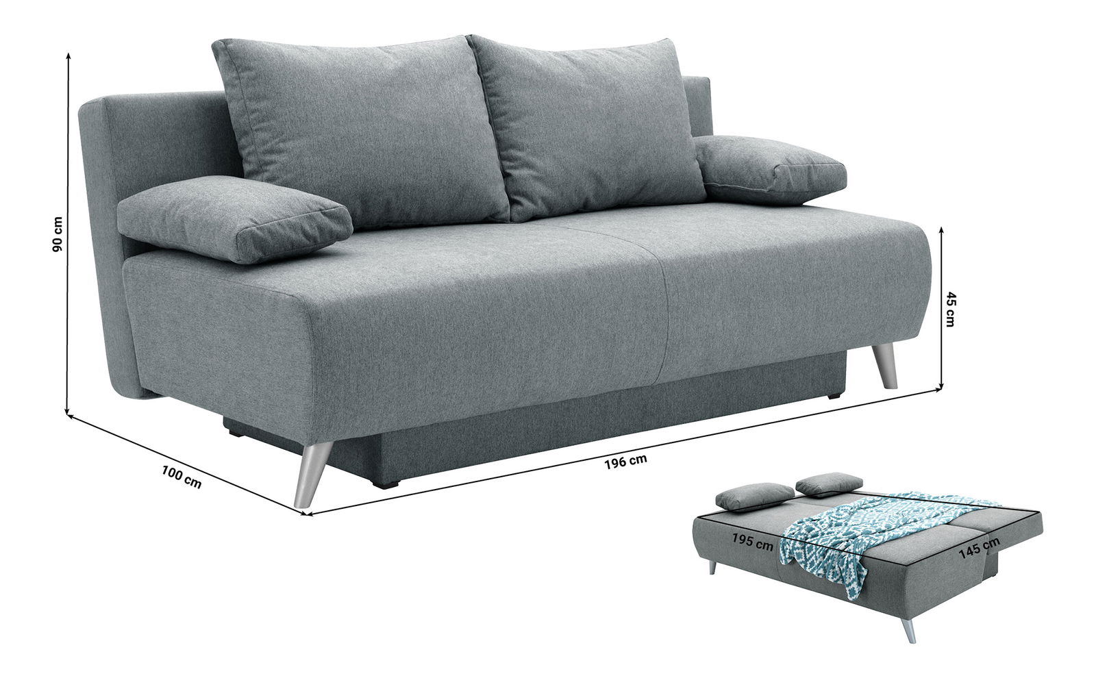 ZobrazitRozkládací pohovka Pelona Vám poskytne náležitou dávku pohody při sezení a sledování televize, či také spaní díky své funkci rozkladu při které není nutné pohovku odsouvat od stěny as rozměry spací plochy 145x195 cm se na ní tak pohodlně vyspí až dvě osoby. Se svým úložným prostorem Vám rovněž poskytne perfektní místo pro uschování Vašich lůžkovin či jiných věcí. Díky svým šikmým zádům také poskytuje nadměrně komfortní sezení díky jemnému sklonu. Celá pohovka stojí na pevných nohách vyrobených z bukového dřeva.