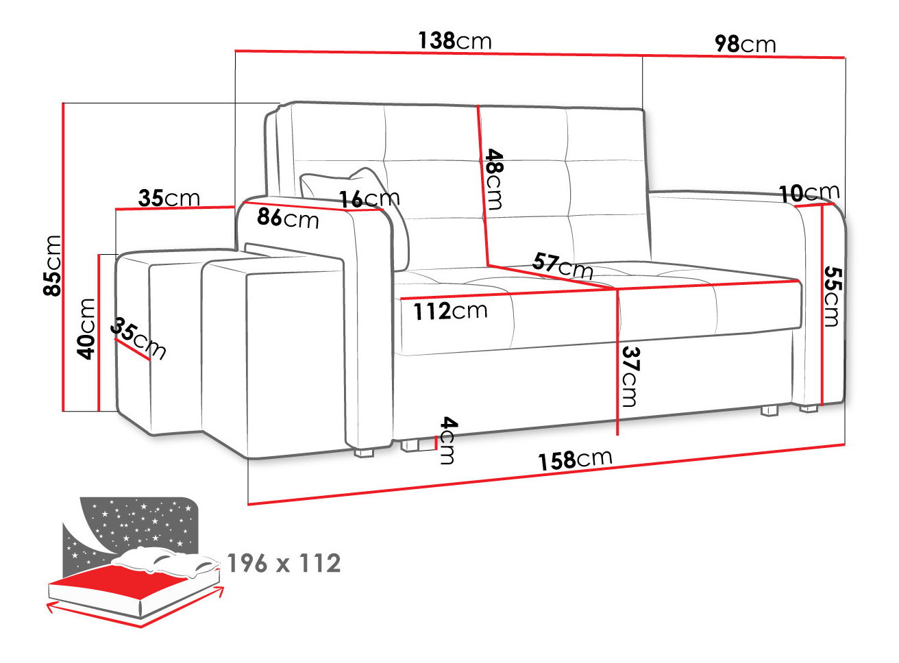 ZobrazitPohovka s taburetkami je ideální volbou pro ty, kteří hledají pohodlí a styl. ozdobou interiéru. Pohovka bude skvělým místem pro odpočinek - je vybavena pohodlnou funkcí spánku a velkým úložným prostorem na ložní prádlo. šířka: 98 cm, výška: 85 cm, plocha na spaní: 196 x 112 cm, rozměry úložného prostoru: délka: 109 cm, šířka: 66 cm, výška: 19 cm Taburetka (x2): délka: 35 cm, šířka: 35 cm, výška: 40 cm a opěradlo: pěna T25/42 + vlnová pružina, taburetky: 7 mm tlustý HDF + polystyrenová struktura + pěna T28 o tloušťce 5 cm, pohovka se dá rozložit, čehož lze využít ke spánku, pohovka disponuje úložným prostorem, nohy: kovové, trvale čalouněné stojící v místnosti (záda potažená látkou) Záruka: 24 měsíců