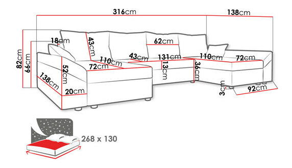 délka: 321 cm, šířka: 139 cm, výška: 80 cm, plocha na spaní: 268 x 130 cm