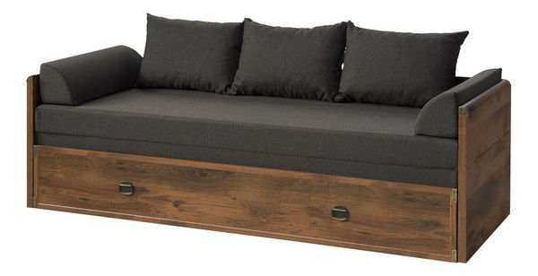 Rozkládací postel Indiana JLOZ 80/160 (Dub sutter) o výšce 61 cm a hloubce 202,5 cm je ideální pro studentské a dětské pokoje. Její masivní westernový vzhled s kovovými rohy a úchyty potěší milovníky přírody a starší děti. Postel lze rozložit na pohodlný gauč s výsuvným úložným prostorem. Čelo postele je z MDF desky s foliovou povrchovou úpravou a rám z dřevotřísky s foliovou povrchovou úpravou. Cena nezahrnuje horní rošt, matraci, polštářky a podhlavníky, které lze objednat z e-shopu. Modelová řada Indiana nabízí krásné komody, poličky, regály, skříňky, stolky a truhlu v barevných provedeních tmavší dub sutter, světlejší borovice antická a bledá borovice canyon. Plocha spaní je 75-150 x 196 cm a tkanina Sawana 03 je jemná, na dotek příjemná pletená látka s texturou pletení. Test oděruvzdornosti Martindale je 80 000 oděrů.