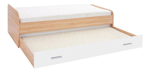 Postel Simply s jednou zásuvkou na matraci. Šířka postele se po vytažení zásuvky zvětší z 95 cm na 187cm.