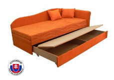 Příjemná a pohodlná rozkládací postel dodávána s molitanovou matrací. Postel se rozkládá vysunutím spodního dílu postele, čímž se posteli dodá zvýšená šířka z původním 80 cm na komfortních 150 cm. Vybavena je úložným prostorem. Nosnost 90 kg. Pravé provedení. Dodávána s polštáři.