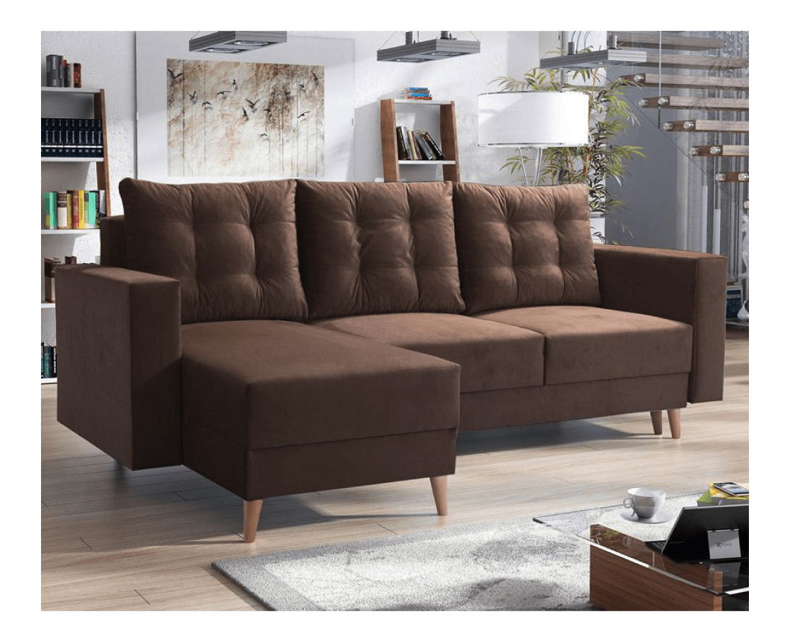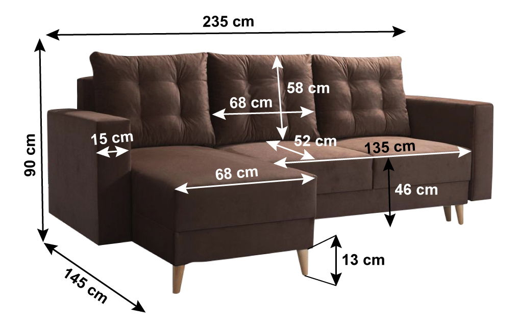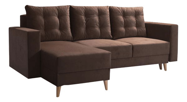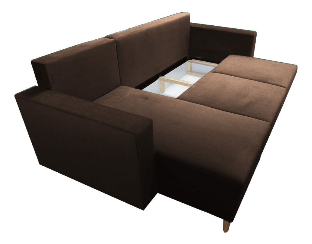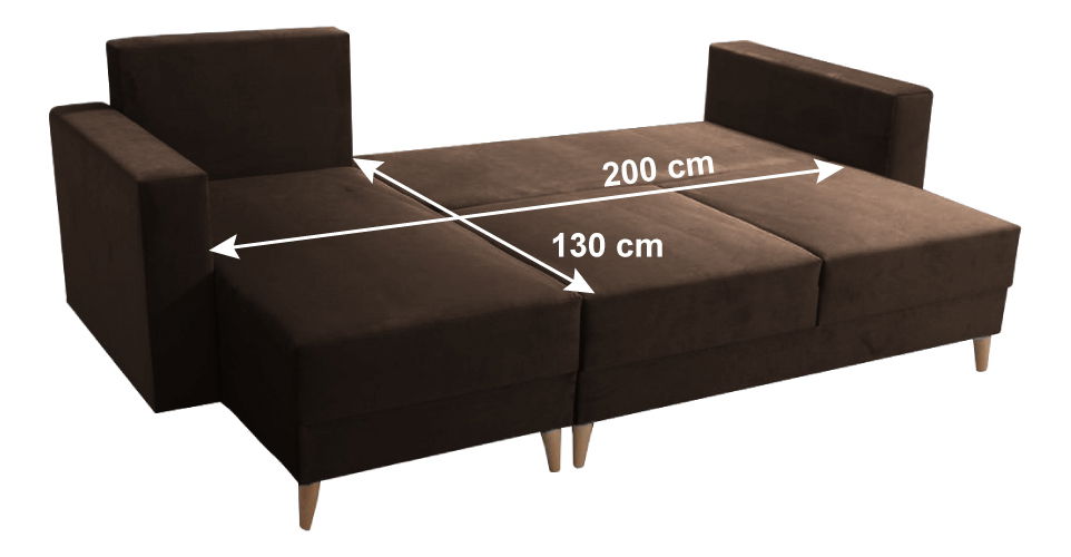 Na dřevěných nožičkách, Dodávána se třemi polštáři, Rozkládací, Rohová, Celočalouněná, S úložným prostorem, Pravé provedení