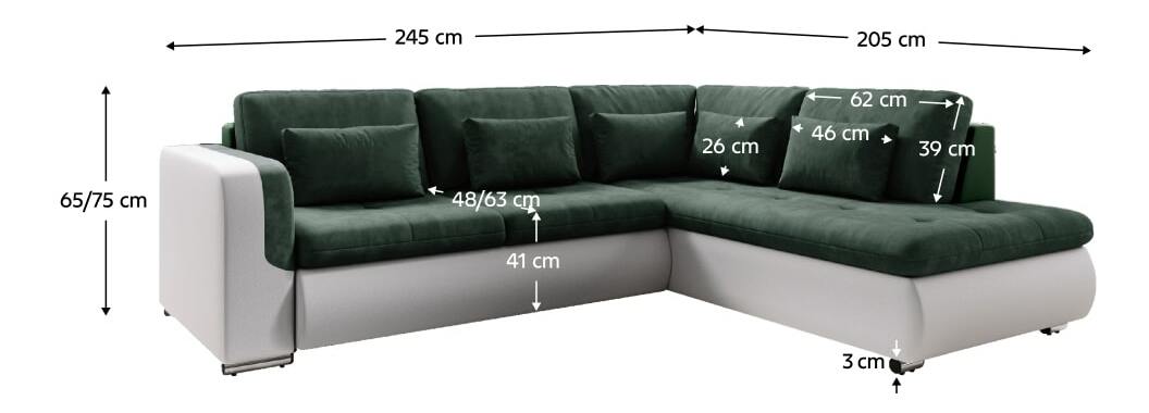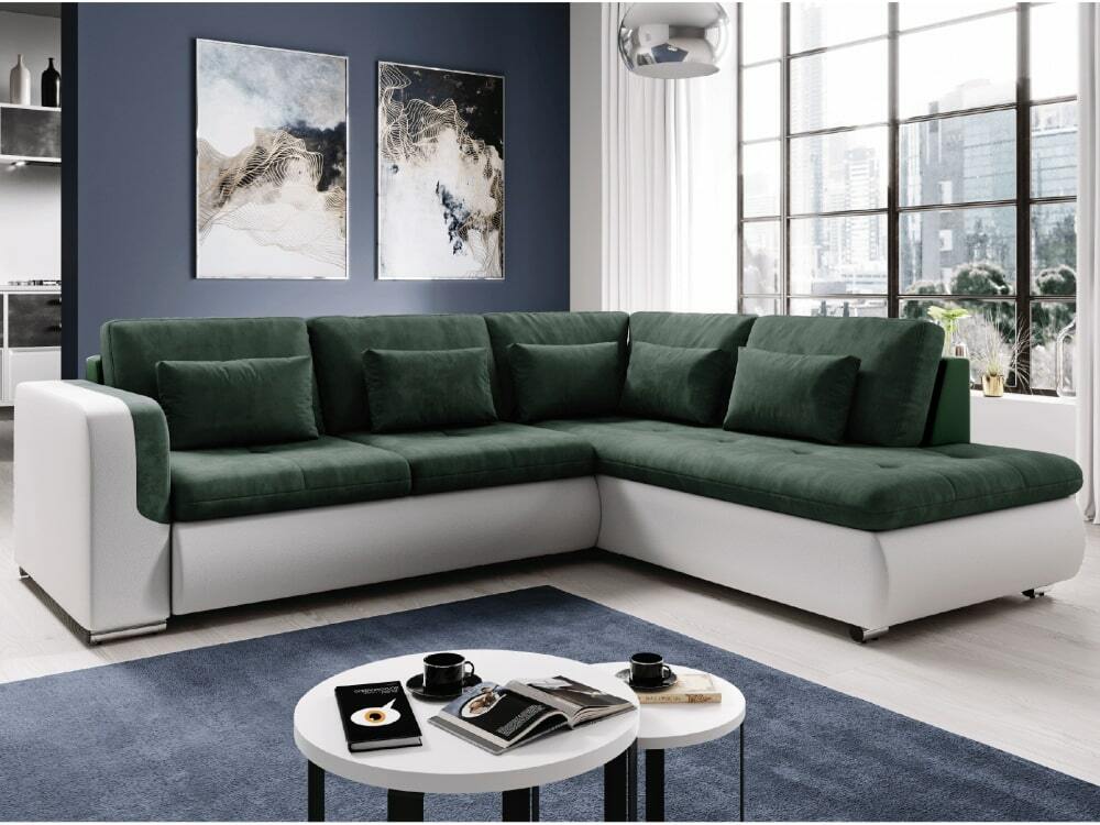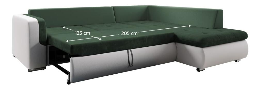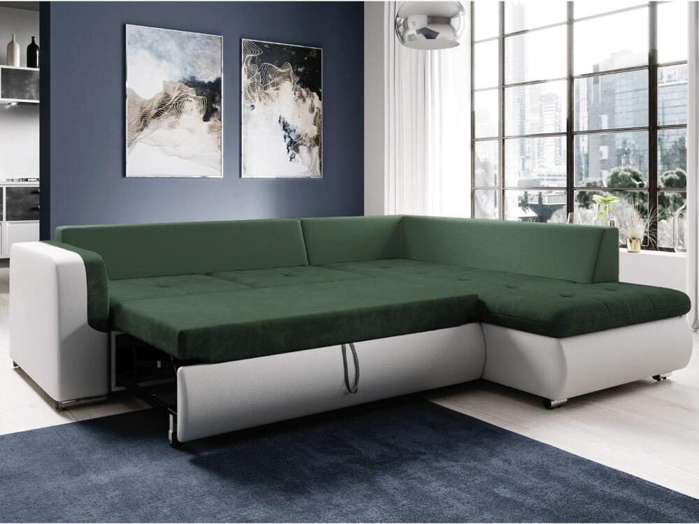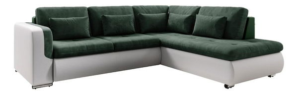 Pohodlnou a zároveň trendovou sedací soupravou je Foldo L ROH. Celočalouněná s možností umístění kdekoli v interiéru. Kombinace bílé ekokůže a zelené látky Seal zvýrazňuje zaoblené tvary sedáku i boční opěrku rukou. O příležitostné spaní se postará její rozklad o rozměru 135x205 cm. Výplň sedací soupravy představuje pružina falista kombinovaná s pur pěnou. Postavena je na plastových nožičkách ve stříbrné barvě. Dodávána je s 5 velkými a 5 malými dekorativními polštářky.