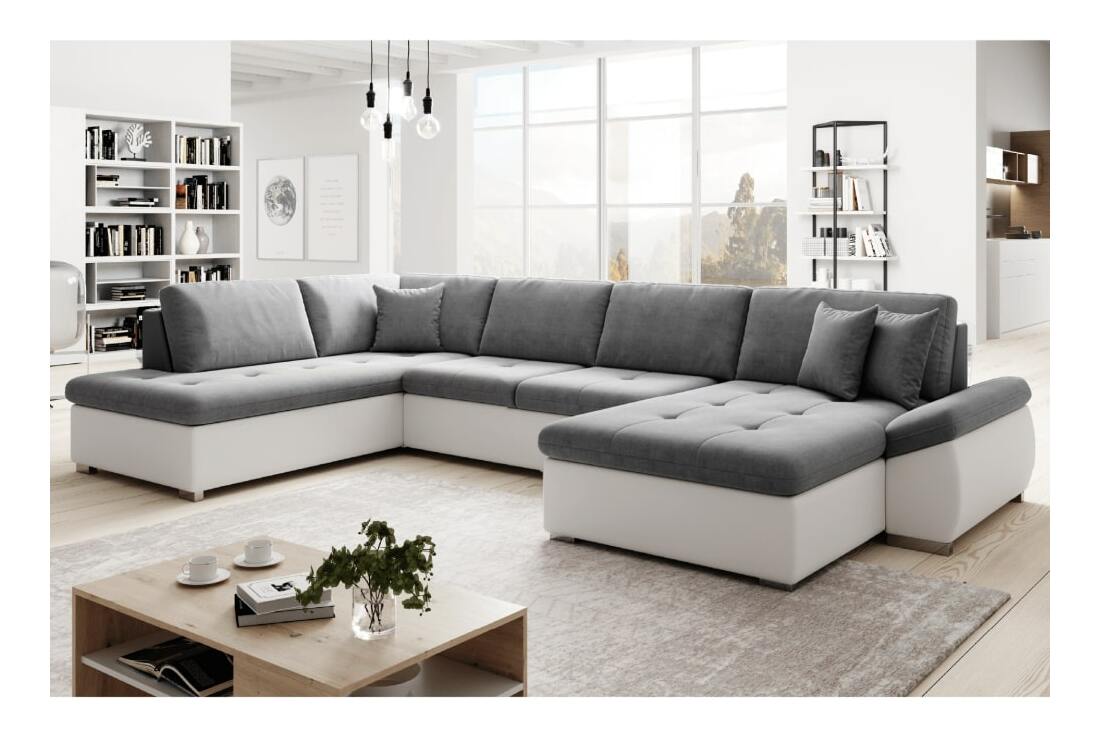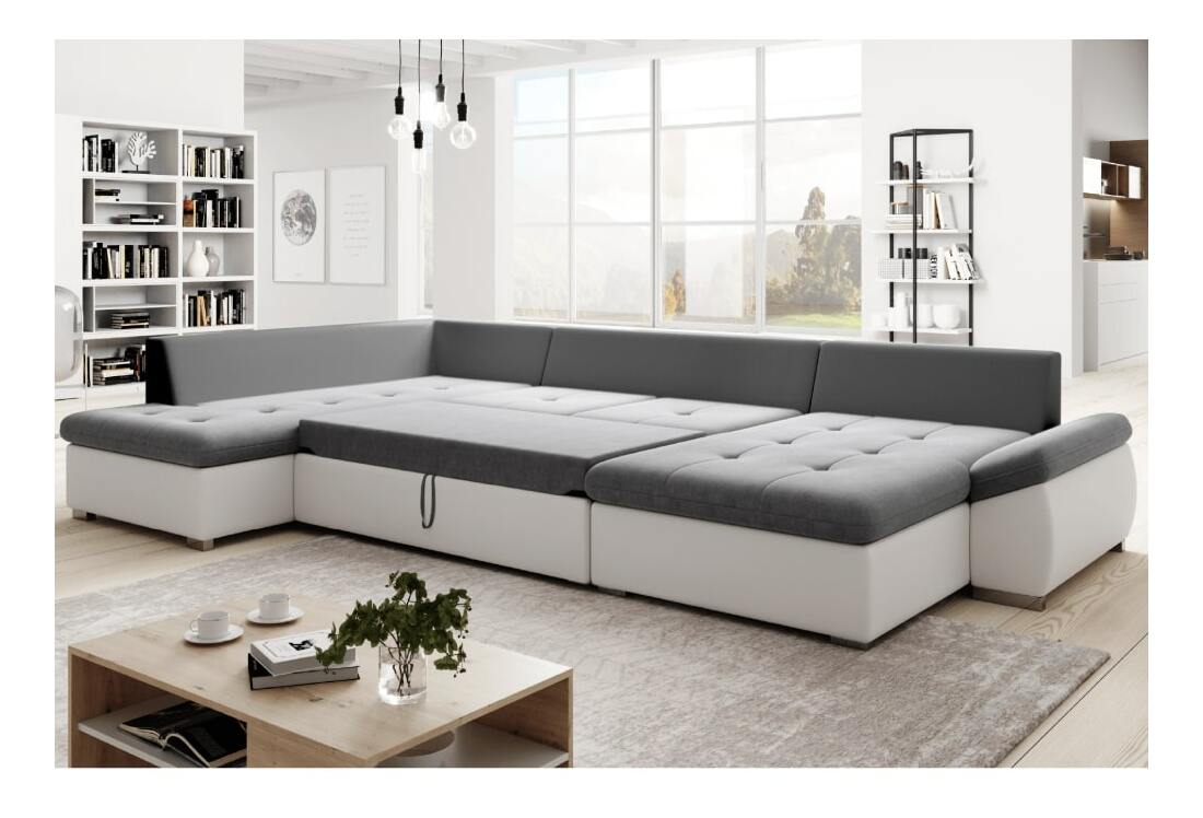 Přes den moderní sedačka a v noci postel, která nabízí prostor pro odpočinek a spánek. Ano, přesně taková je rohová sedací souprava Matras U. Jednoduše ji rozložíte na plnohodnotné lůžko o rozměru 135x285 cm. Pastvou pro oči je oblíbená bílá ekokůže v kombinaci s látkou Soro v nestárnoucím šedém barevném provedení. Je celočalouněná, postavte ji doprostřed místnosti, aby vynikl její design a propracované detaily. Součástí sedací soupravy je šest velkých polštářů a tři malé, které nemusí sloužit jen jako zpestření sedací soupravy, ale také jako pohodlné opření zad. Konstrukce stojí na plastových nožičkách, které dodávají sedací soupravě Matras U potřebnou pevnost a stabilitu. Sedačka, která do puntíku splní všechny vaše představy.