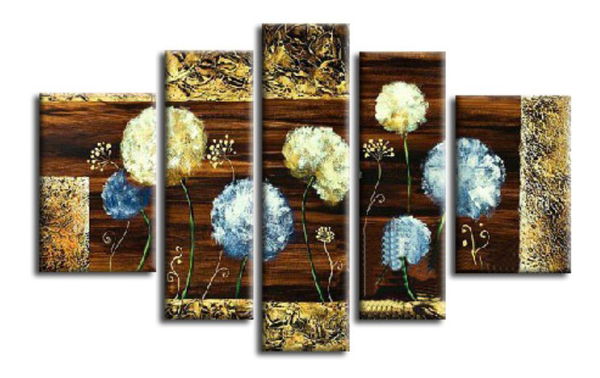Prázdnou stěnu v obývacím pokoji, předsíni nebo pracovně osvěžíte tímto 5-dílným ručně malovaným obrazem s motivem květin, který je vytvořen kombinací akrylových a olejových barev. Nanesená struktura vytváří 3D efekt. Obraz je namalovaný na kvalitním plátně a je natažený na dřevěném rámu. Obraz má háček, čili si ho můžete ihned zavěsit.