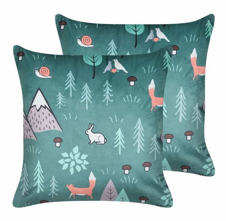 Dodejte kouzelnou atmosféru jakémukoli prostoru pomocí této soupravy dvou polštářů v krásném odstínu zelené s okouzlujícím lesním motivem rozkošných zvířátek a vysokých stromů. Snímatelné potahy jsou zárukou snadné údržby, takže i díky tomu jsou tyto polštáře ideálním doplňkem do dětského pokoje, kde se kreativita snoubí s pohodlím.