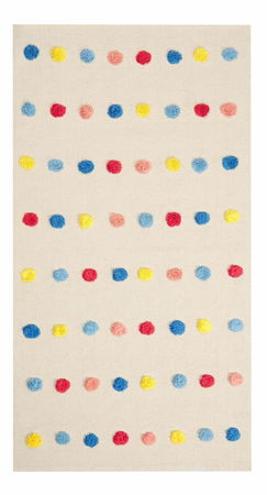 Tento koberec vnese do dětského pokojíčku hravý a veselý nádech. Díky pestrobarevným mini bambulím rozzáří každý prostor a podnítí fantazii vašeho dítěte. Je vyroben z měkké a odolné bavlny a dětem poskytne příjemný a pohodlný prostor pro hraní. Protiskluzová vrstva zajistí bezpečnost během dobrodružství při různých hrách.