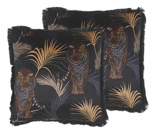 Dodejte své pohovce nebo posteli zvířecí atmosféru pomocí těchto dekorativních polštářů. Unikátní motiv tygra na černém pozadí dokonale ladí s moderními a glam interiéry. Ozdobné třásně na okrajích a sametová struktura polštářů umocňují celkový vzhled tohoto kousku.