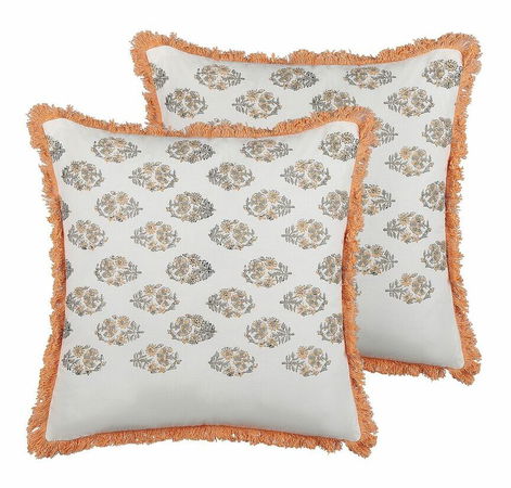 Váš interiér získá svěží vzhled, doplníte-li jej těmito dekorativními polštáři. Květovaný vzor, vyrobený ručně technikou blokového tisku, zvýrazňují okraje v oranžové barvě. Polštáře jsou vyrobeny z bavlny a mají polyesterovou výplň a zapínání na zip.