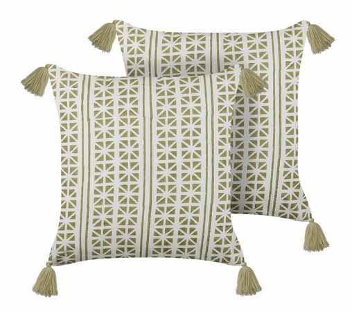 Ozdobte svou pohovku těmito nádhernými polštáři s ozdobnými třásněmi a geometrickým vzorem vyrobeným technikou blokového tisku. Polštáře jsou vyrobeny z bavlny, která zaručuje pohodlí při používání. Díky svému designu jsou vhodným doplňkem do interiérů v boho nebo vintage stylu.
