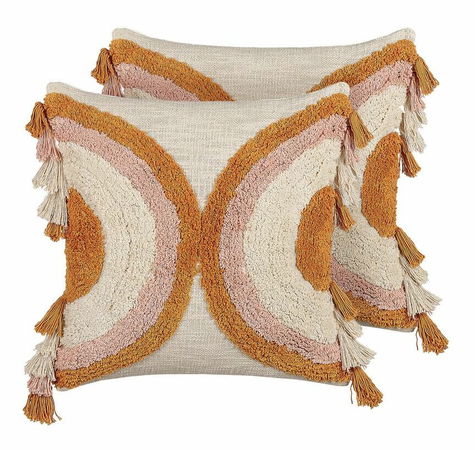 Zkrášlete interiér svého obývacího pokoje s touto sadou polštářů, která jí dodá útulný a příjemný vzhled. Geometrický vzor inspirovaný duhou s jedinečnou texturou a třásněmi, z nichž dělají poutavou dekoraci. Polštáře mají bavlněný potah, měkkou výplň a zapínání na zip.