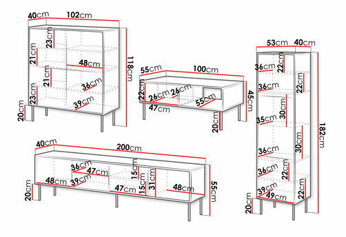 Souprava nábytku do obývacího pokoje Hermano I dodá vašemu bytu elegantní vzhled a zároveň se stane pohodlným místem k bydlení. TV skříňka je ústředním bodem každého obývacího pokoje, ideální pro umístění TV a multimediálního vybavení. Má prostorné police, které vám umožní uložit kabely, dálkové ovladače a další příslušenství. Před sedačkou bude stolek do obývacího pokoje vypadat perfektně. Prostorná pracovní deska je ideální pro podávání nápojů a občerstvení a dvě spoličky poskytují další prostor pro časopisy, knihy nebo dálkové ovladače. Štíhlá forma komody nezabere mnoho místa a nabízí prostorné přihrádky, které organizují prostor. Dalším prvkem nábytku do obývacího pokoje je vitrína, která efektně zobrazuje dekorace a nádobí. Je také vybavena uzavřenými policemi, skvělými pro odkládání méně vizuálně atraktivních předmětů.