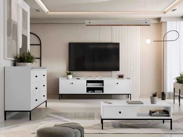 Tři praktické prvky, které tvoří sadu nábytku do obývacího pokoje Tezarta I, dokonale zařídí každý interiér. Tato praktická souprava poskytne dostatek úložného prostoru a místo pro vystavení suvenýrů z dovolené či jiných dekorací. Praktické zásuvky a šikovné police pojmou vše potřebné. Každá část má kovový rám, který dodá celému aranžmá lehkost. Prezentovaný nábytek do obývacího pokoje je skvělým způsobem, jak koherentně zařídit obývací pokoj.