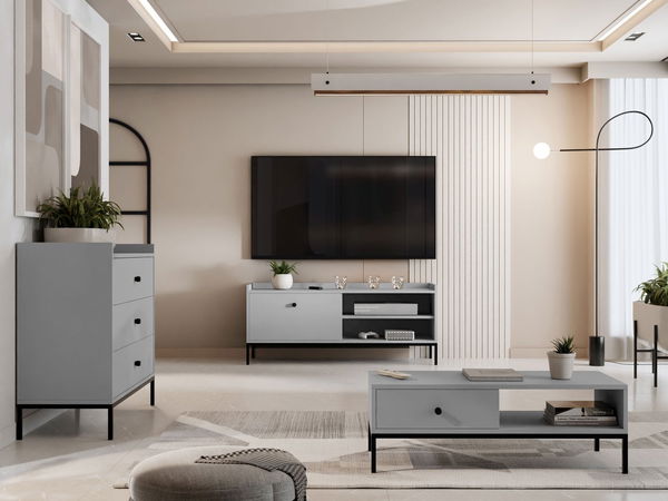 Souprava nábytku do obývacího pokoje Tezarta II s jemným stylem zapadne do každého aranžmá. Černé detaily v podobě nožiček a držadel dodávají celku třídu a eleganci. Souprava obsahuje komodu se třemi prostornými zásuvkami, TV skříňku a stylový konferenční stolek s policí a zásuvkou. Souprava obsahuje vše, co potřebujete k uspořádání funkčního a stylového obývacího pokoje. Nábytek do obývacího pokoje se vyznačuje čely mírně rozšířenými za desku. To dává místnosti velký akcent, jakož i jedinečnost a praktičnost celého návrhu.