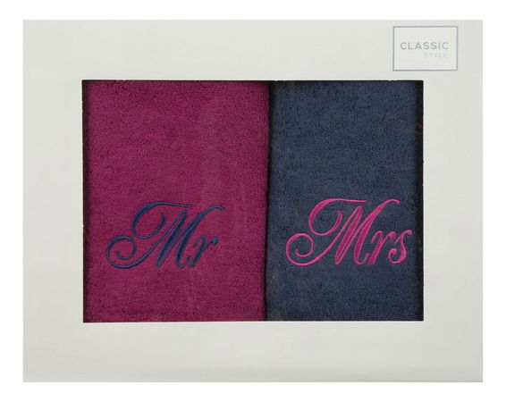 Sada ručníků 50x90 cm Mr. Mrs (amarant + tmavě modrá)