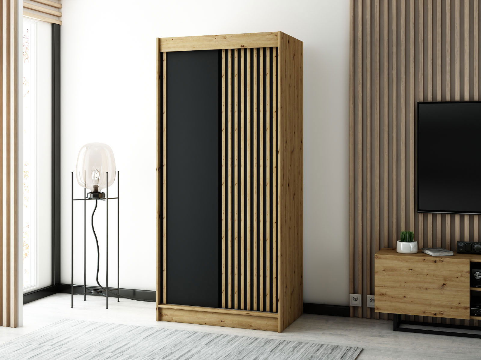 Šatní skříň 100 cm Ladonna (dub artisan + černá matná) s výškou 200 cm a hloubkou 62 cm je ideálním řešením pro uložení vašich oděvů a doplňků. Tato moderní skříň je vyrobena z laminované desky (16 mm) a má přední stranu z laminované desky ( 16 mm) s lamelami (2 mm) Otevření je vybaveno bezúchytkovým systémem a součástí jsou také hliníková vedení s posuvným systémem BIMAK. Skříň má stylový design v dub artisan a černé matné barvě. jednoduchou svépomocnou montáž. Skříň je k dispozici ve třech balících a rozměry jsou: bal. 5x200,5x62,5 cm/43 kg, balík č. 2 - 9,5x97,5x60,5 cm/31 kg, balík č. 3 - 3,5x188x50,5 cm/26 kg přídavné zásuvky, které mají rozměry 10x70x50 cm/5 kg.