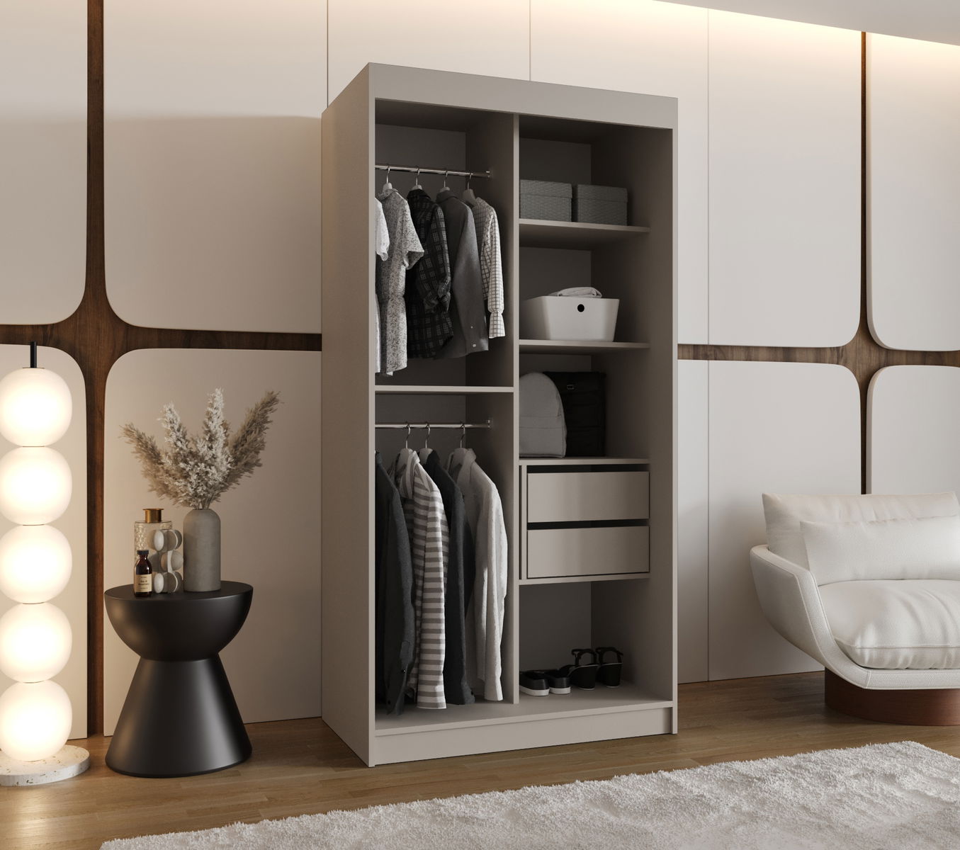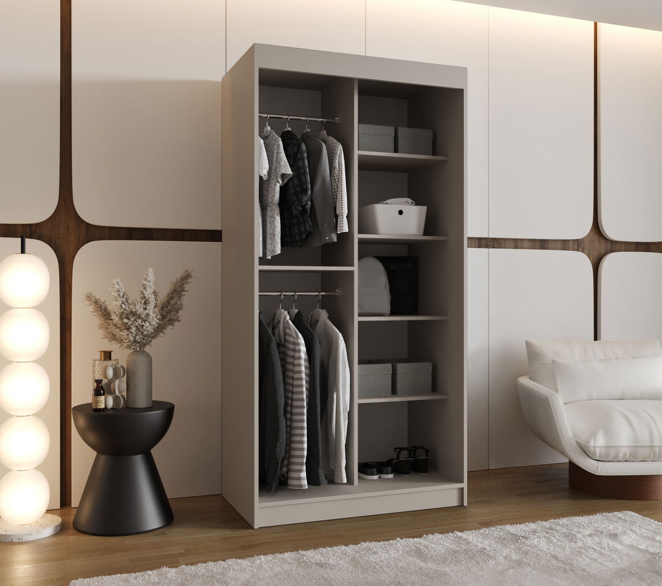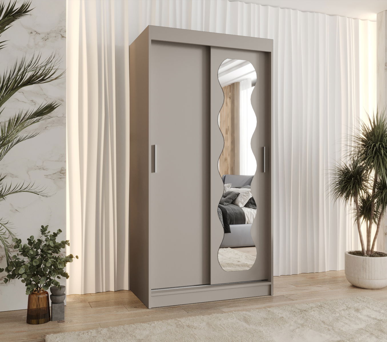 Šatní skříň s posuvnými dveřmi a zrcadlem Spock je vyrobena v moderním, ale zároveň nadčasovém stylu. K dispozici ve čtyřech barvách a šesti různých velikostech.