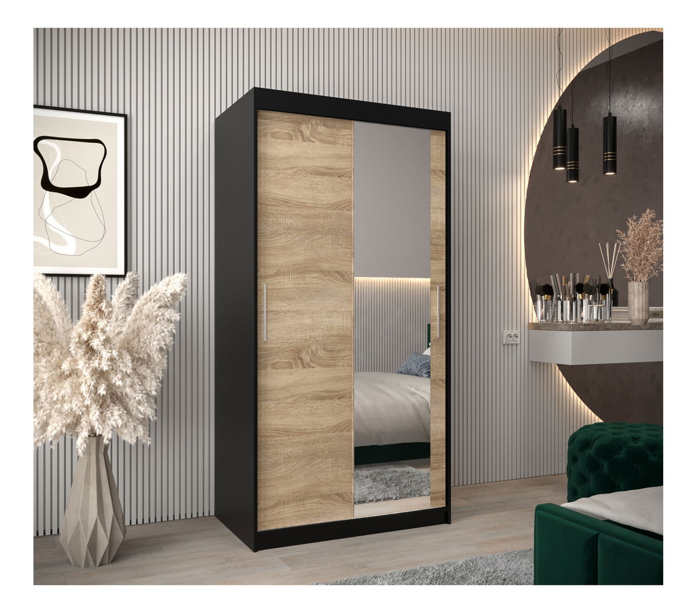 Šatní skříň 100 cm Toki 2 (Černá matná + Dub sonoma)